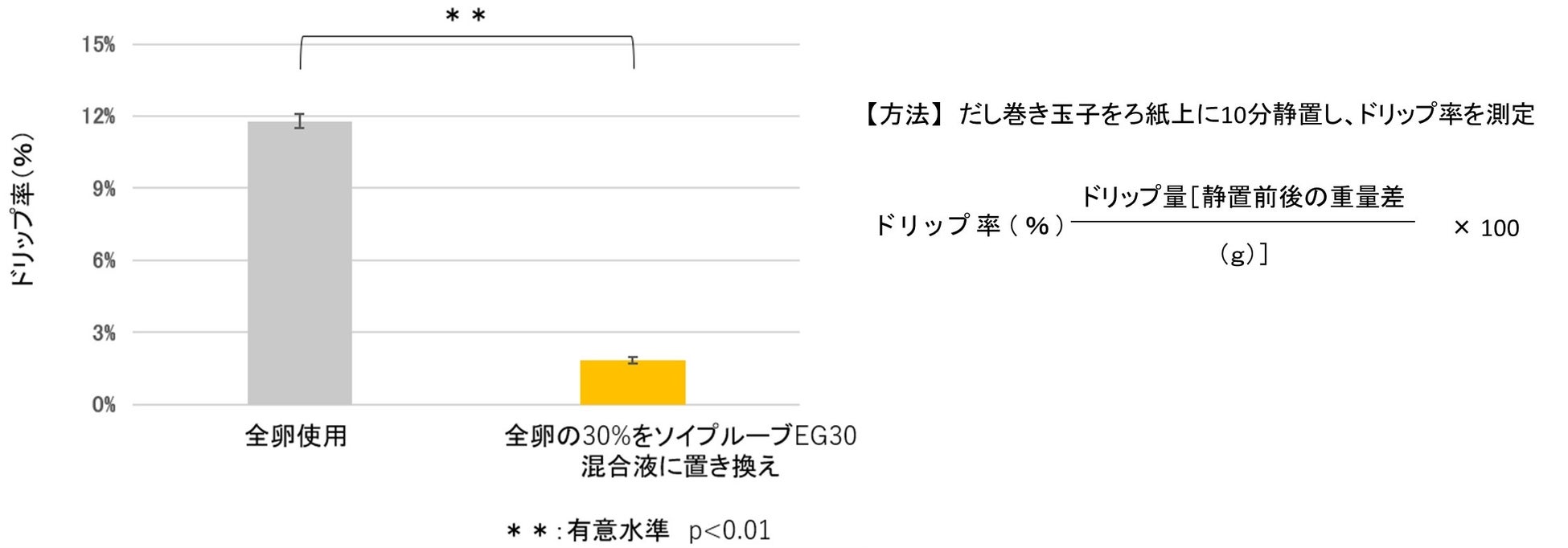 全卵中の約30%を「ソイプルーブEG30」混合液に置き換えることで、製品の冷凍・解凍で生じるドリップ流出を低減することができます。