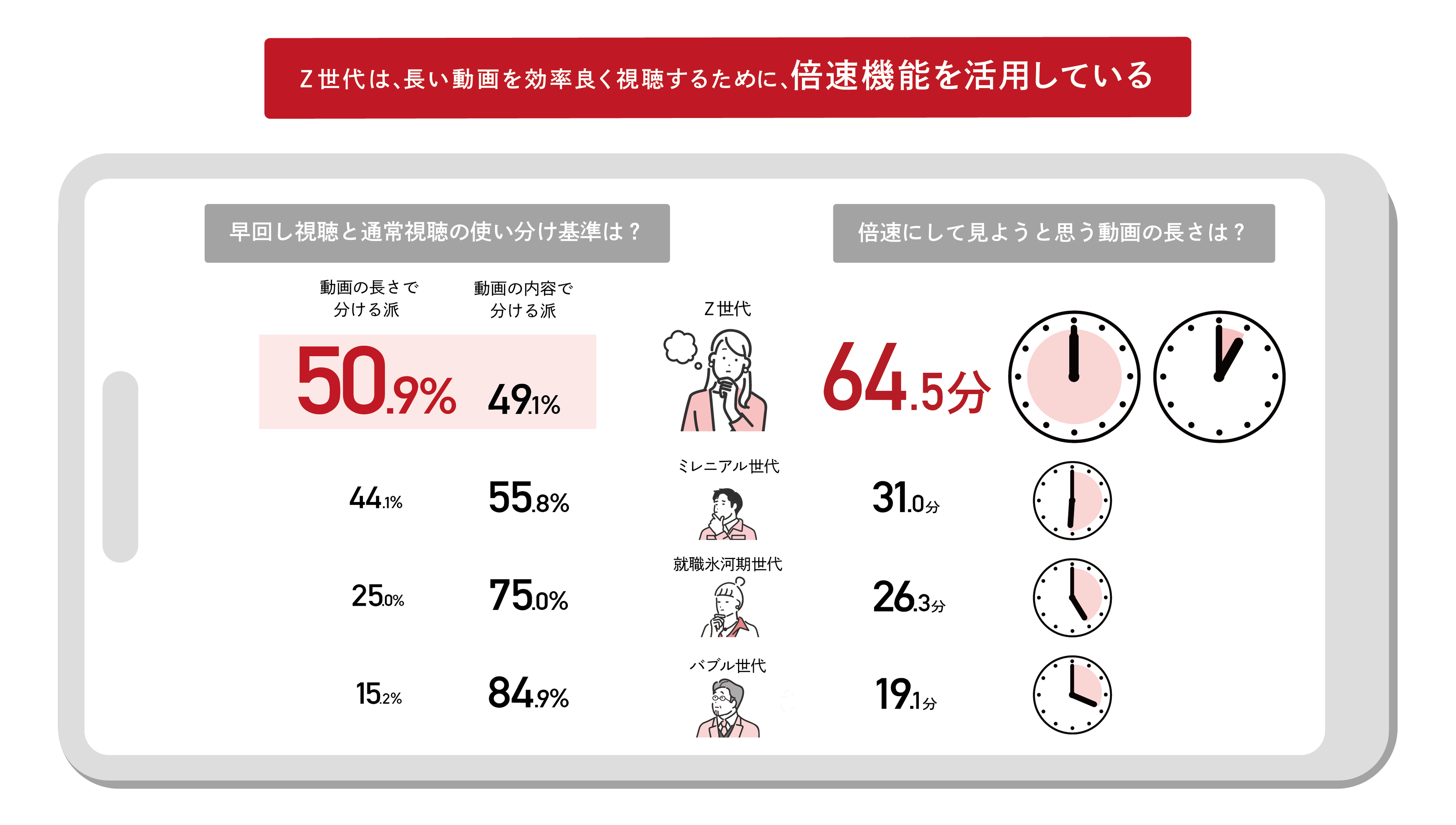 倍速視聴する基準、Z世代は“動画の長さ派“が50.9%に対し、他世代は“動画の内容派”傾向。