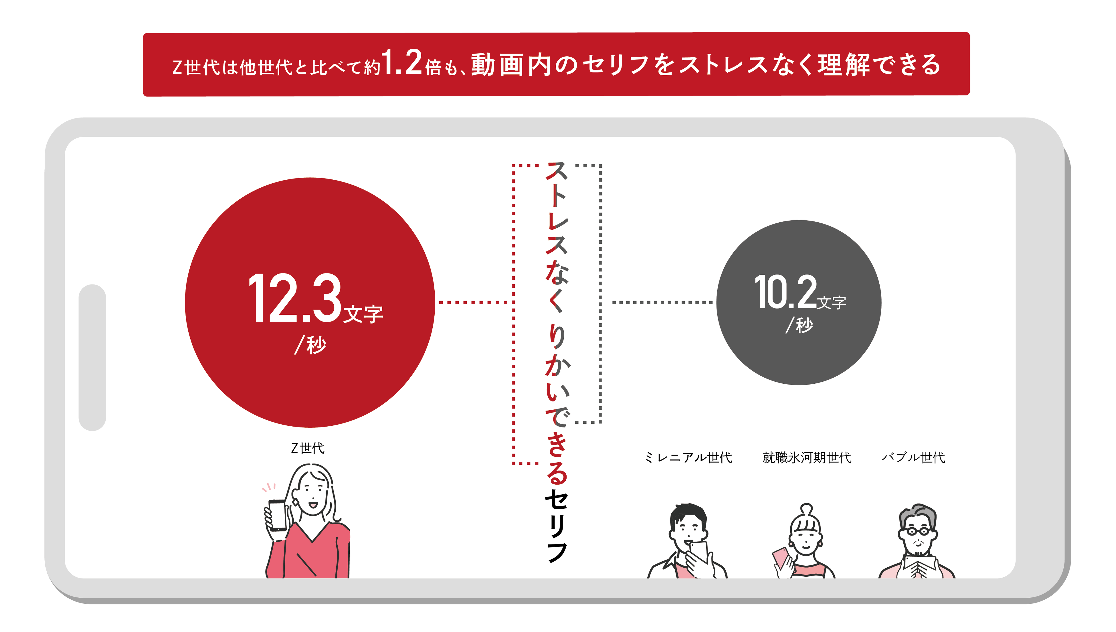 さらに、快適に感じる速度を、動画内で話しているセリフ“1秒あたり”の文字数に換算※3すると、Z世代は“1秒あたり12.3文字”、一方、他世代は“1秒あたり10.1文字”ということが判明しました。