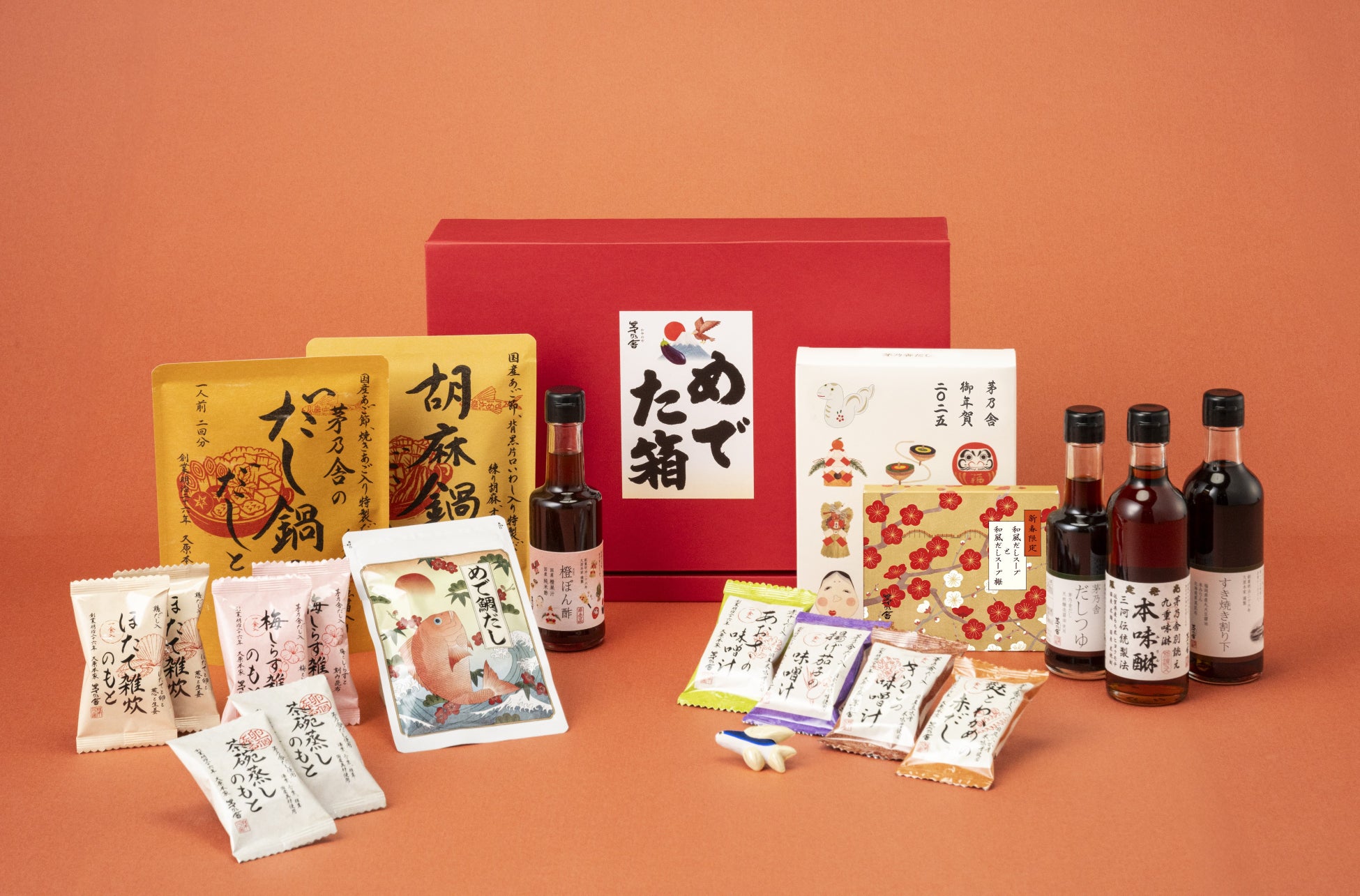 新春限定「めで鯛だし」や、2025年の干支である巳などの絵柄をあしらった「茅乃舎だし 御年賀贈答箱2025」など、年末年始にお役立ていただける商品を中心に、人気商品を華やかな色の箱に詰め合わせてご用意いたしました。