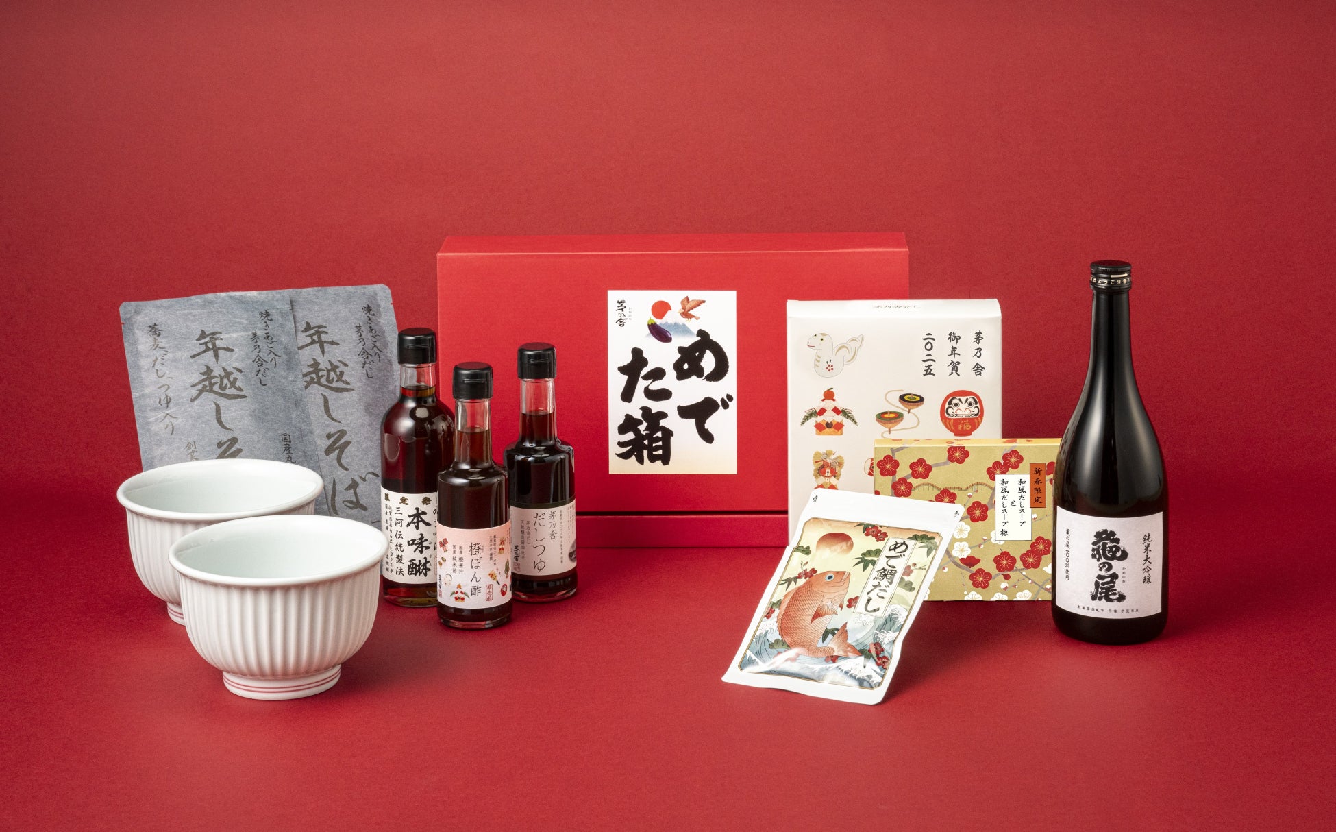 茅乃舎だし御年賀贈答箱2025/めで鯛だし(5袋入)/橙ぽん酢 200ml/茅乃舎だしつゆ 200ml/深川製磁 しのぎ深丼 明治釉(めでた箱限定色)×2/本味醂 300ml/伊豆本店 純米大吟醸 亀の尾/新春限定だしスープセット(和風5袋入、梅5袋入)/年越しそば×2