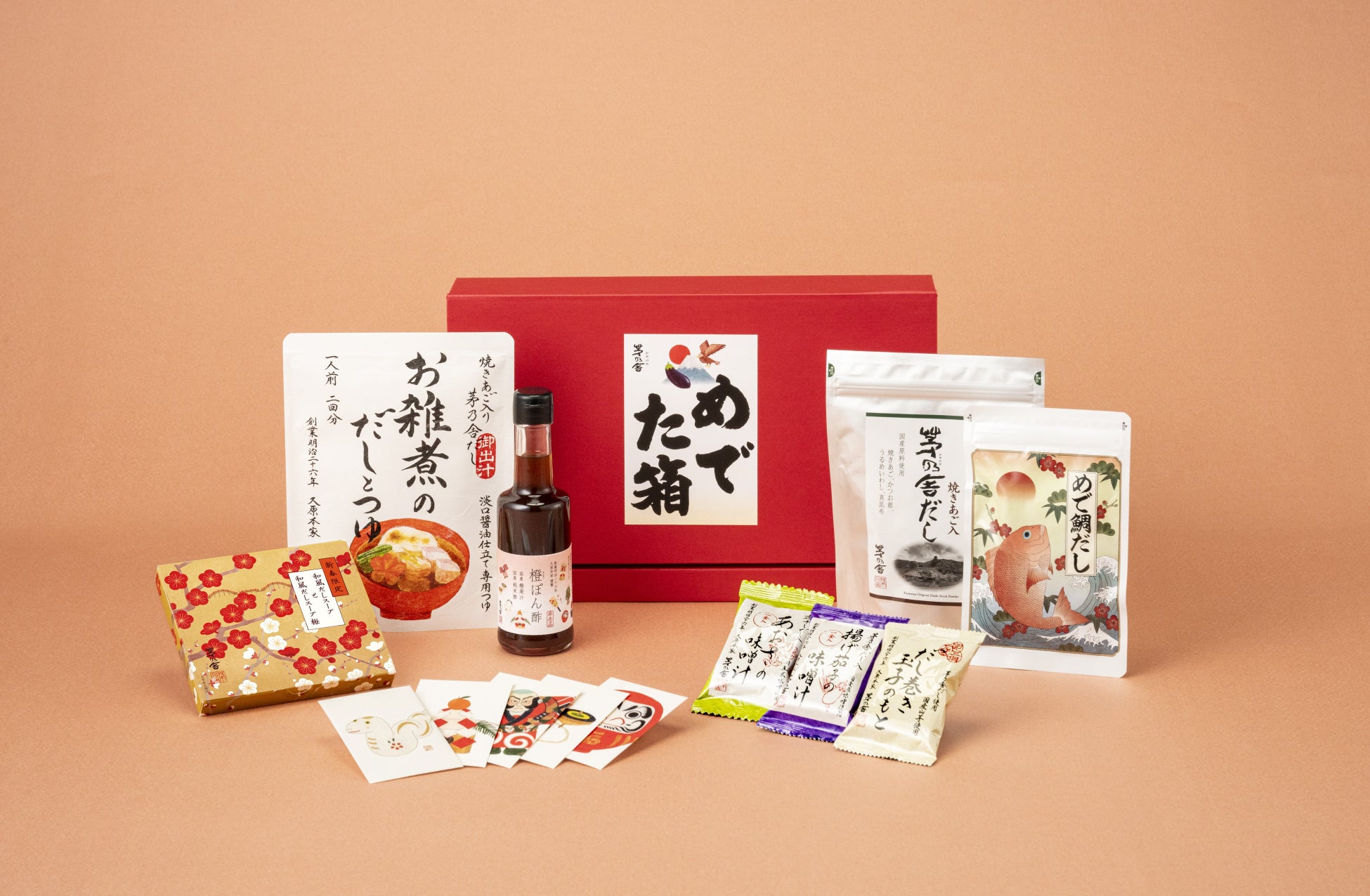 新春限定だしスープセット(和風5袋入、梅5袋入)/めで鯛だし(5袋入)/橙ぽん酢 200ml/お雑煮のだしとつゆ/茅乃舎だし(8g×12袋入)/だし巻き玉子のもと(1食)/揚げ茄子の味噌󠄀汁(1食)/あおさの味噌󠄀汁(1食)