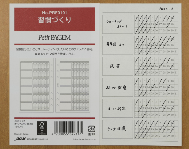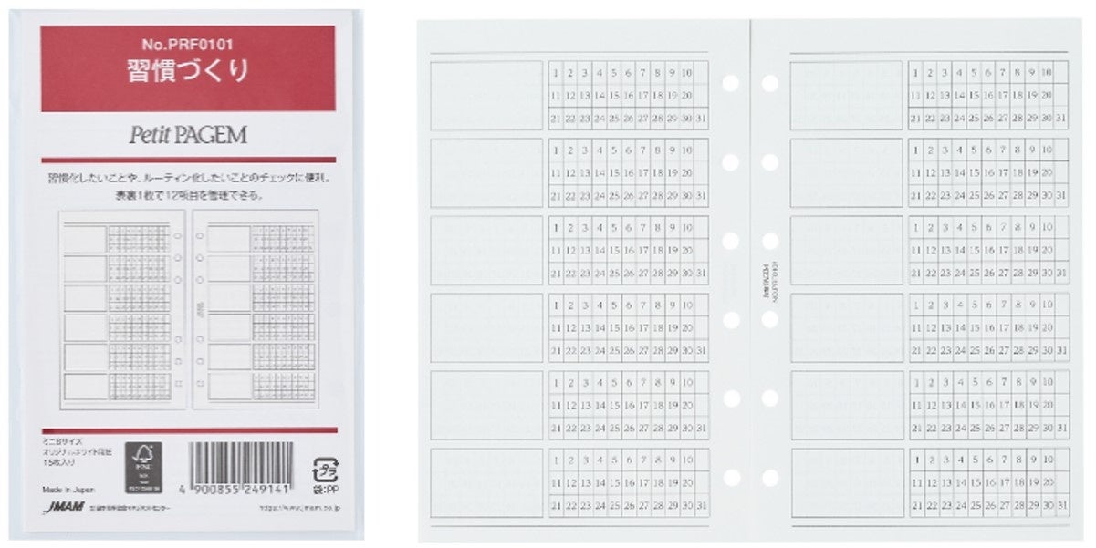 習慣化したいことや、ルーティン化したいことのチェックに便利。表裏1枚で12項目を管理できる。