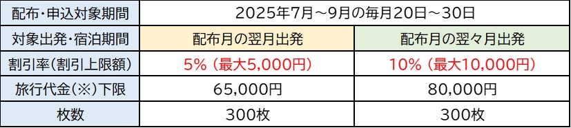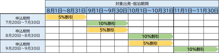 2025年5月7日(水)~2025年8月6日(水)、2025年8月18日(月)~9月30日(火)の出発・宿泊が対象です。※平休日の出発限り(土曜日または祝祭日の前日出発は割引対象外)