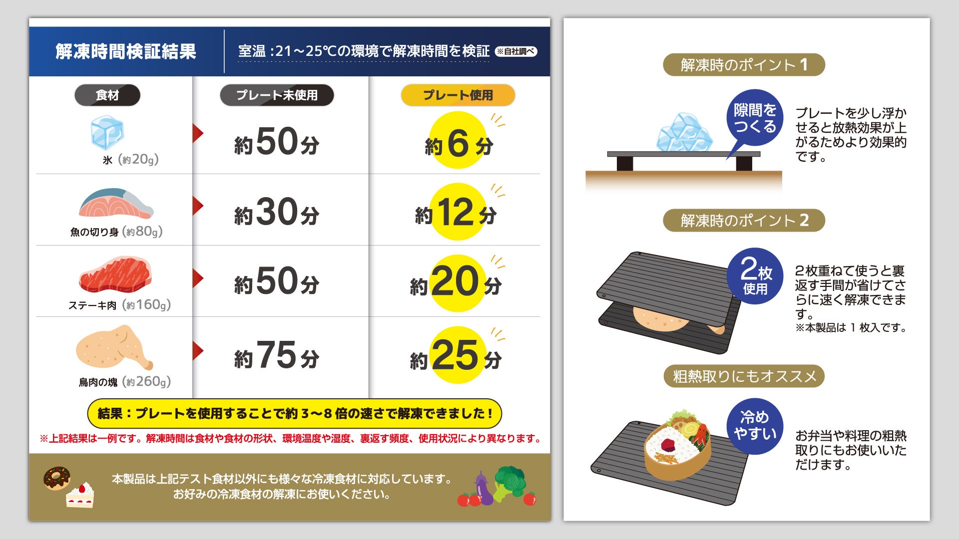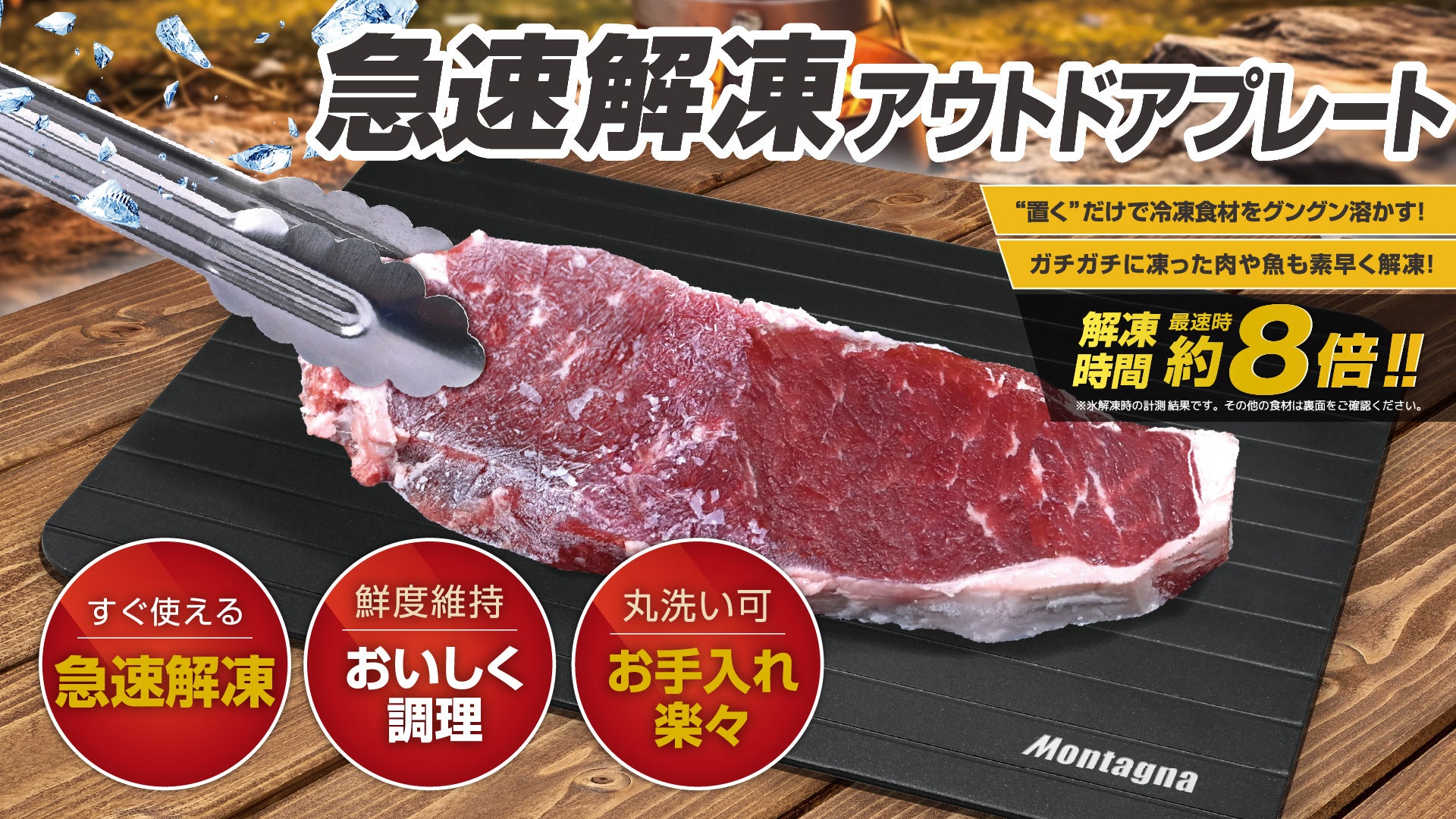 特徴:“置く”だけで冷凍物をグングン素早く解凍!凍ったお肉や魚をプレートに置くだけで最大8倍の解凍時間を実現。熱伝導率に優れたアルミ素材のプレートで、手間のかかるアウトドア調理を時短アシスト。解凍ムラや粗熱取りの悩みを解決して料理の効率を大幅にUP。