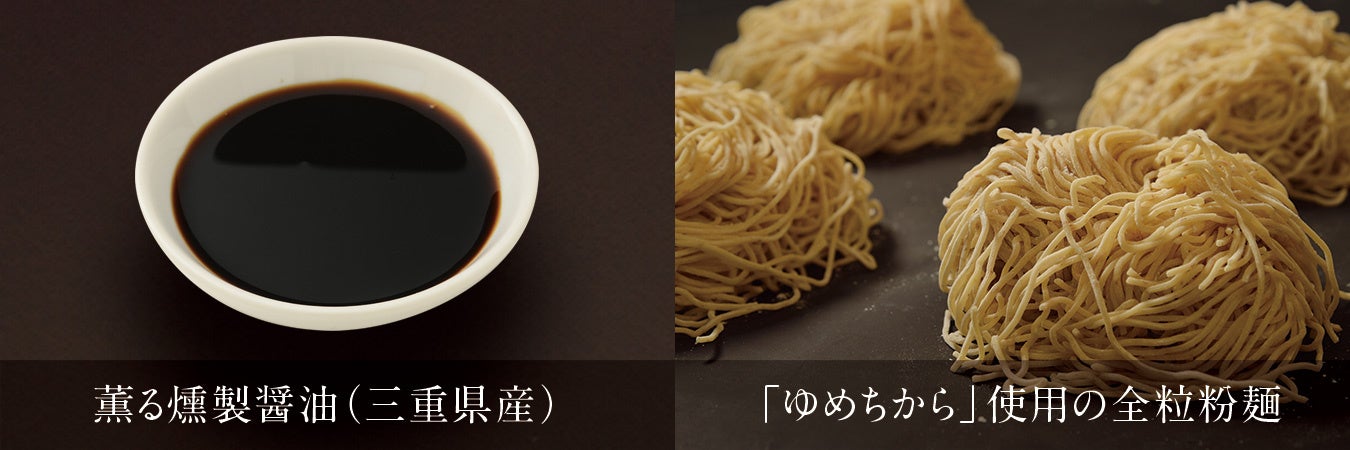 三重県産の本醸造醤油をブレンドしました。醤油かえしをナラ・クスギの木でじっくりと燻した薫香と旨味が特徴で、麺薫る芳醇醤油らーめんの味の根本を司る厳選した醤油です。