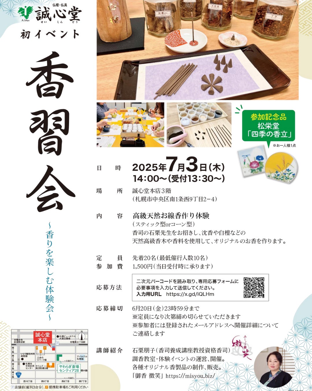 株式会社あいプラン(北海道札幌市)の仏壇・仏具を取り扱う誠心堂は、2025年7月3日(木)に誠心堂本店にて、初の体験型イベント「香習会(こうしゅうかい)~香りを楽しむ体験会~」を開催いたします。