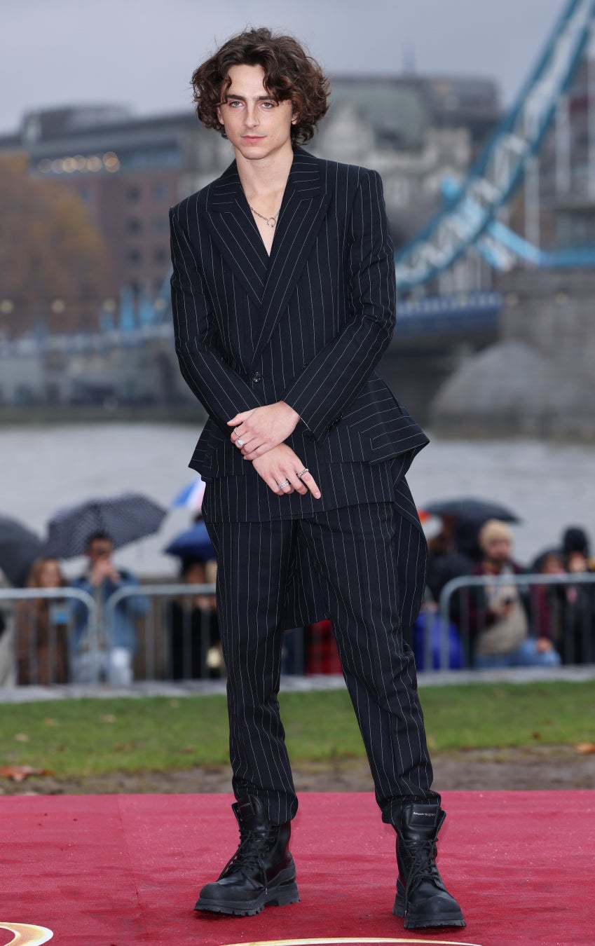 11月27日にロンドンで開催された「ウォンカとチョコレート工場のはじまり」のフォトコールにて、ティモシー・シャラメが2024年春夏コレクションより、ピンストライプのブラックウールを用い、ドレープが特徴的なダブルブレストテーラードジャケットとシガレットトラウザー、ブラックレザーのワンダーブーツを着用して登場しました。