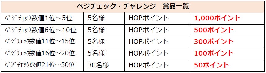 期間中に様々な会場で開催される「推定野菜摂取量測定会」に複数回参加し、最も高い数値の上位50名様には、賞品「HOPポイント」をプレゼントする「ベジチェック・チャレンジ」にぜひご参加ください!