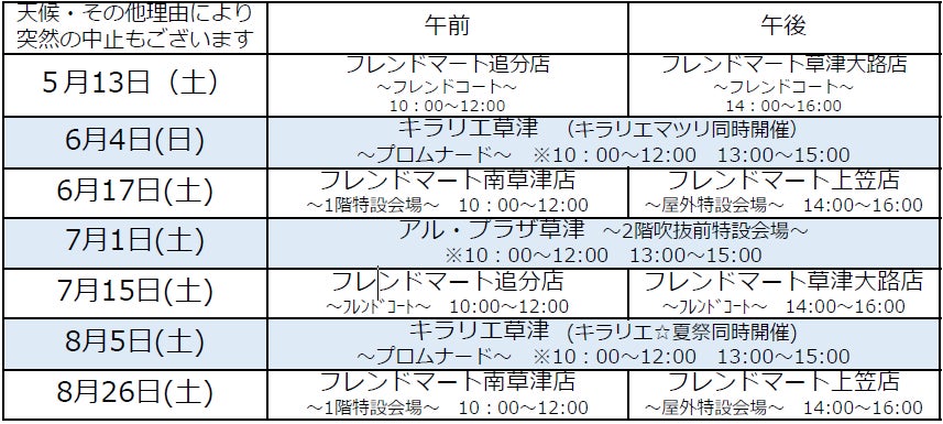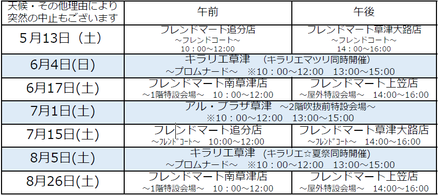 ・10:00~15:00 アル・プラザ草津 ※12:00~13:00除く。