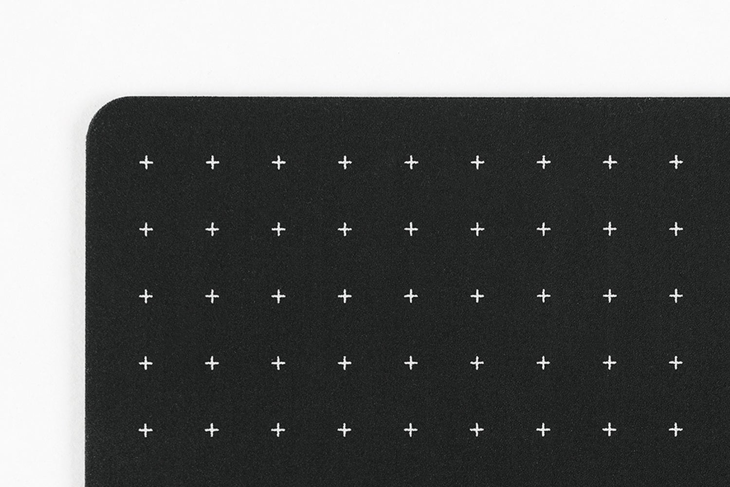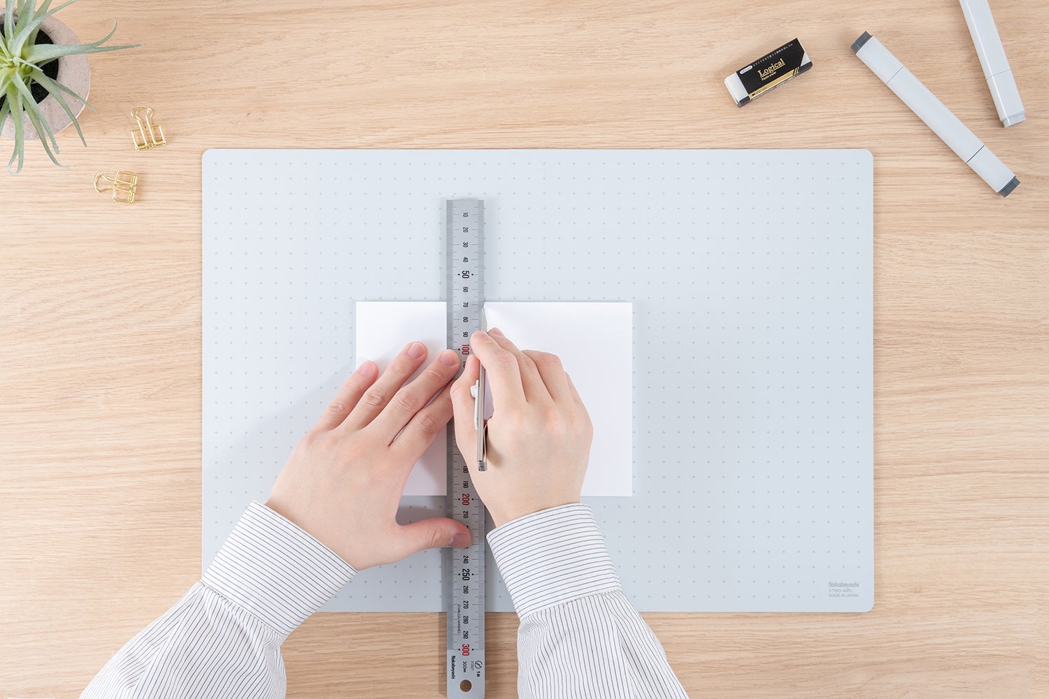 盤面には、直角がわかりやすい格子罫線と、邪魔にならないドット罫線をいいとこどりをした「十字罫線(1cm間隔)」を採用しました。必要最低限のデザインでありながら、水平・垂直の位置が取りやすく実用性も抜群です。