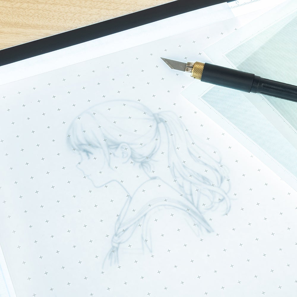 程よく光が透き通る、半透明素材を採用しています。スクリーントーンを用いた作業や、切り絵などライトテーブルのキズつきを防止しながら、その場でカッティング作業を行えます。