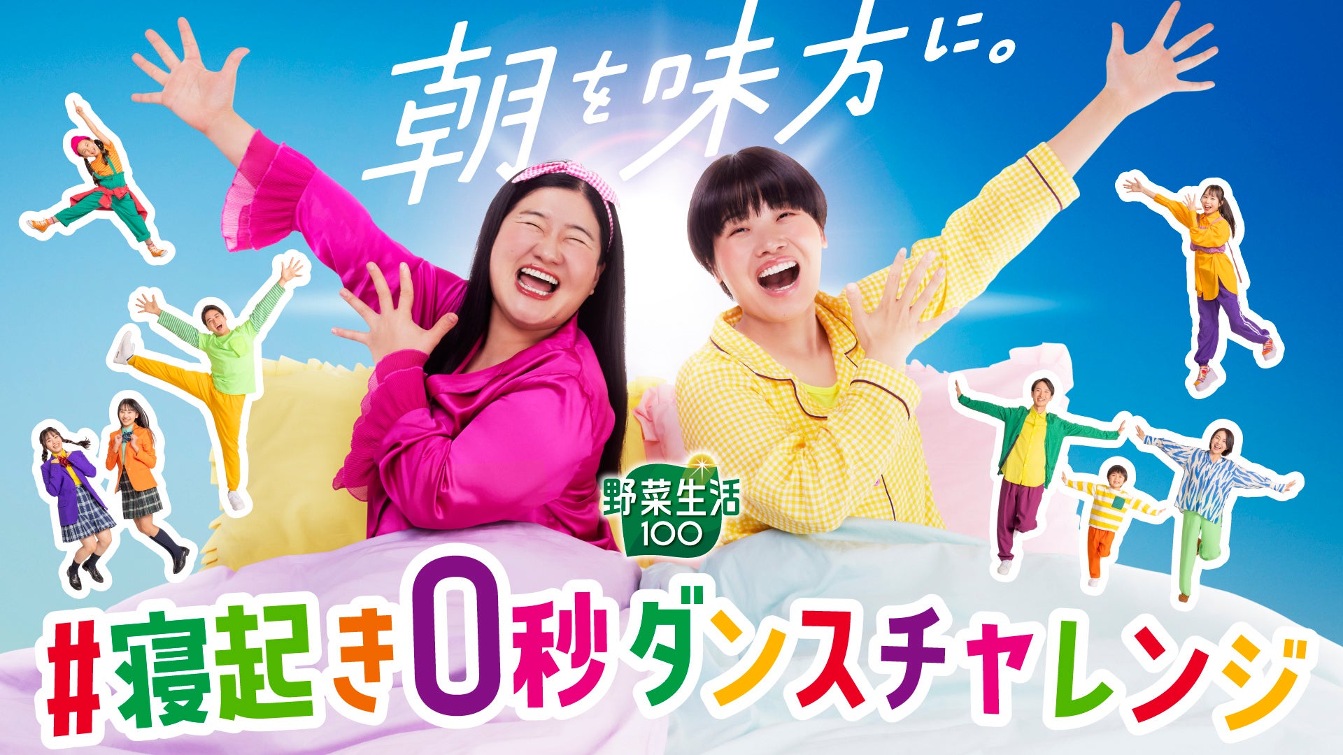 「野菜生活100」のCMで流れている緑黄色社会の曲に合わせて、寝起き0秒でダンスを踊り、指定のハッシュタグを付けてTikTokに投稿いただくと、ガンバレルーヤと共演してスペシャルCMに出演&「野菜生活100」をプレゼント。(※キャンペーンは終了しています)