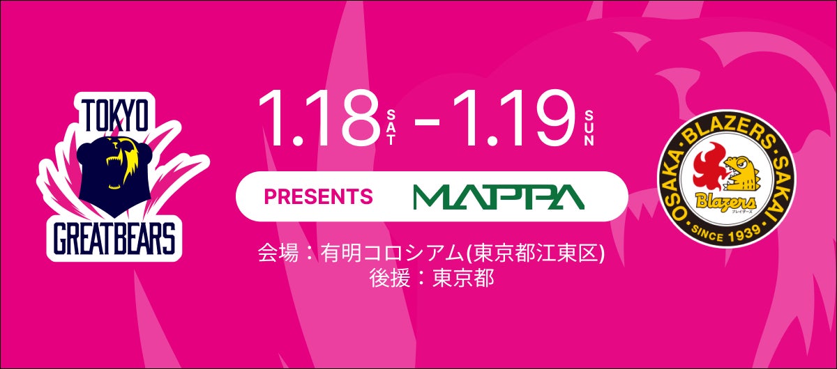 株式会社グレートベアーズ(本社:東京都渋谷区、代表取締役:久保田健司)は、2025年1月18日(土)、19日(日)に有明コロシアムにて開催される2024-25 SV.LEAGUE MEN 東京グレートベアーズ ホームゲーム 日本製鉄堺ブレイザーズ戦において、東京グレートベアーズオフィシャルパートナーである株式会社MAPPAをマッチデースポンサーとして、ホームゲームを開催することとなりましたので、お知らせいたします。