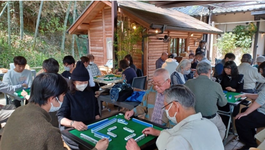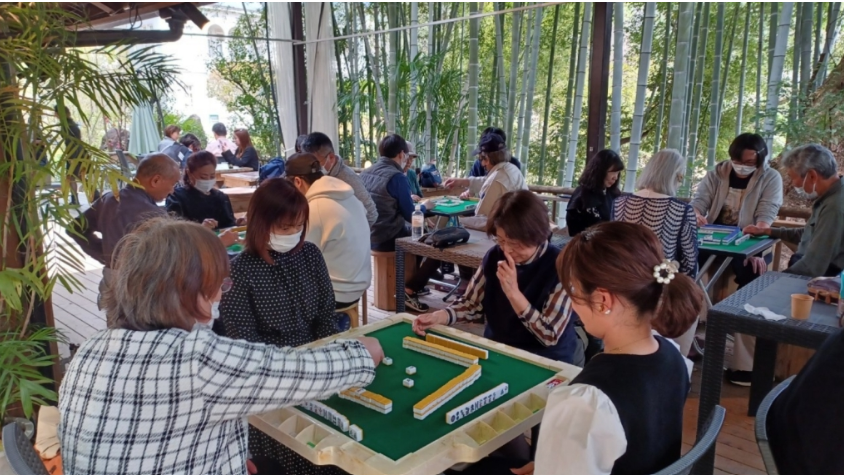 気持ちの良い季節に健康マージャンを屋外テラスで楽しむ