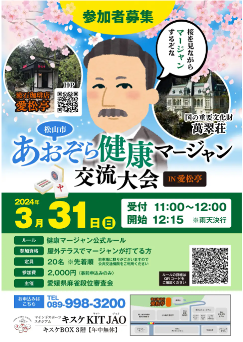 「松山市あおぞら健康マージャン交流大会」は、春の桜のもと健康マージャンを楽しむことを目的に、マージャンが室内に限らずどこでも誰でも楽しめるのではないかという、競技のあり方へ挑戦すべく、また、マージャン店で遊技することのできない、18歳未満の方でも健康的にマージャンという競技の楽しさを体験できる場として開催されます。