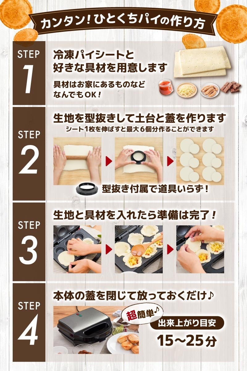使い方は市販の冷凍パイシートを付属の抜き型で型抜きし、生地を本体にセット、セットした生地の中にお好みの具材を入れ、型抜きした蓋部分の生地をかぶせて本体を閉じれば準備が完了。あとは15分~25分程度でサクサクの美味しいパイが出来上がります。ウィンナーやミートボールを入れてスナックパイに、チョコレートやクリームチーズなどを入れてデザートパイも作れます。
