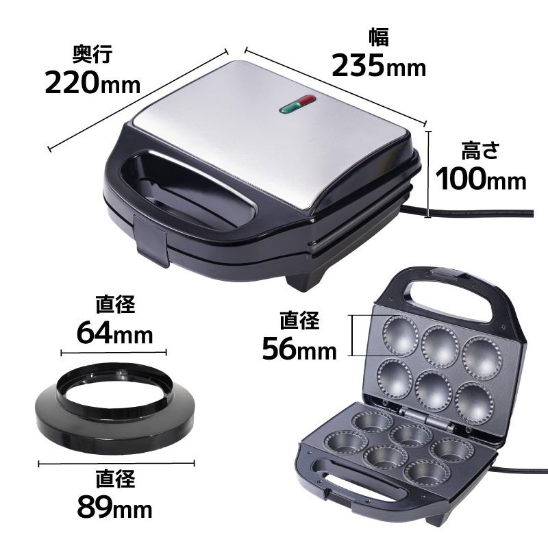 本体サイズ幅23.5×奥行22×高さ10cm。直径約5.5cmのパイが一度に6個作れます。