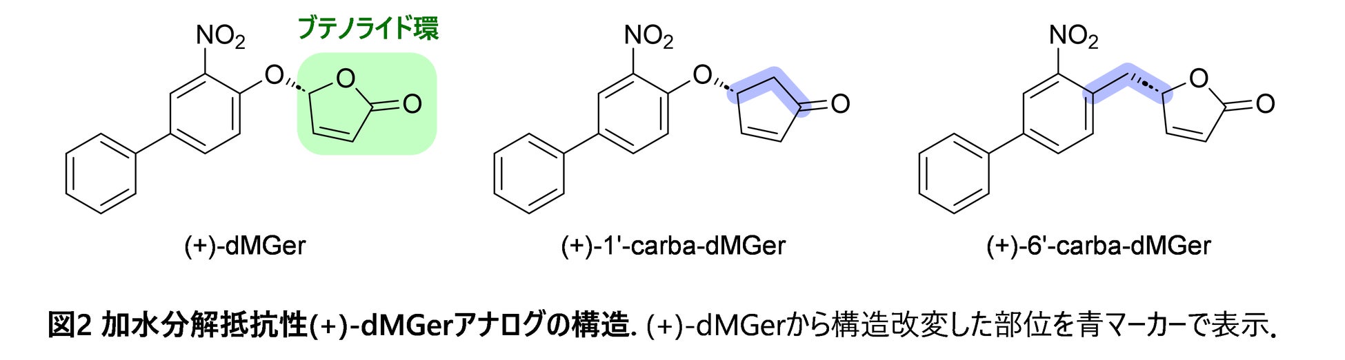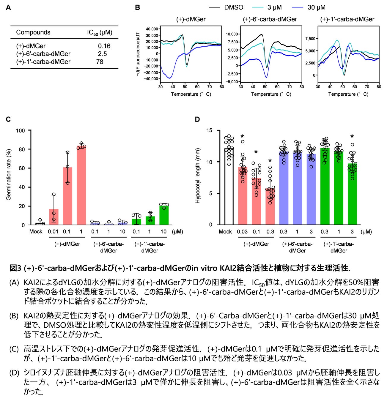 KAI2アゴニストであるdMGerをリード化合物として、dMGerの2-フラノン環をシクロペンテノン環に置換した1'-carba-dMGerと、フェノールエーテル結合を炭素-炭素結合に置換した6'-carba-dMGerを合成しました(図2)。これにより、1'-carba-dMGerは加水分解されず、6'-carba-dMGerは仮に加水分解されてもKAI2と共有結合しない分子構造にしました。いずれのdMGerアナログも、鏡像異性体注11)を分割した後、各種試験に用いました。以降は、鏡像異性体間で活性の強かった(+)-体の結果について示しています。
