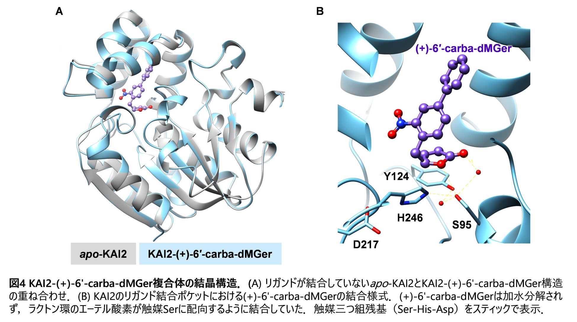 (+)-1'-Carba-dMGerと(+)-6'-carba-dMGerは、いずれもin vitroの実験でKAI2と結合し、(+)-dMGerと同様に、KAI2の熱安定性を低下させました(図3A及びB)。しかし、(+)-dMGerと異なり両化合物は高温ストレスによるシロイヌナズナ種子の発芽阻害を緩和せず(図3C)、赤色光下での胚軸伸長阻害活性も(+)-dMGerのそれと比較して非常に弱いものでした(図3D)。また酵母ツーハイブリッド法注12)においても、(+)-dMGerはKAI2と下流のシグナル制御因子であるSUPPRESSOR OF MAX2_1(SMAX1)との相互作用を誘導した一方、(+)-1'-carba-dMGerと(+)-6'-carba-dMGerはこの相互作用を誘導しませんでした。さらにX線結晶構造解析により、(+)-6'-carba-dMGerは加水分解されることなく、図2で示した分子構造のままKAI2の触媒ポケットに結合することが分かりました(図4)。