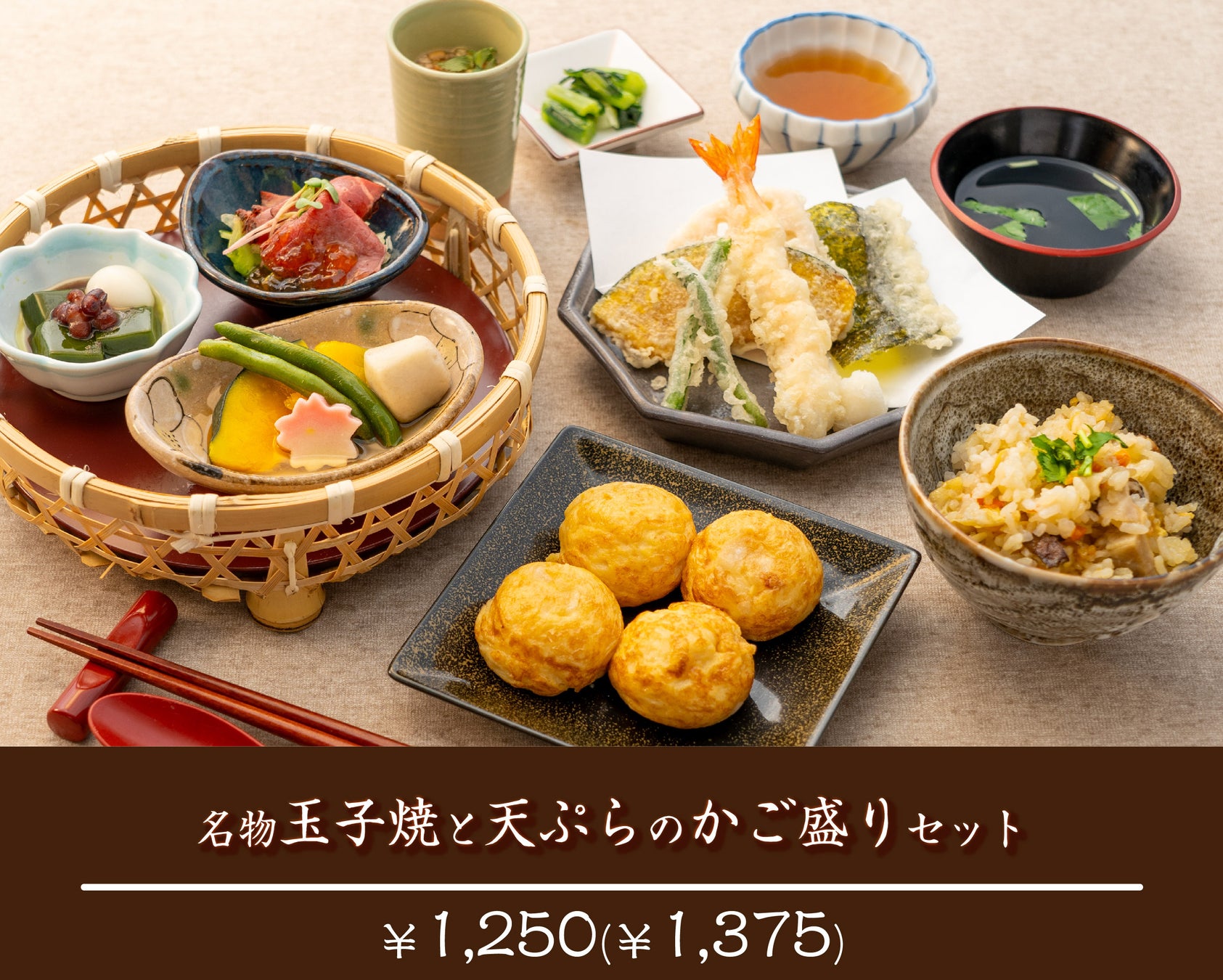 ・名物玉子焼 揚げたて天ぷら盛り 季節の炊き込みご飯 小鉢 お出汁 小さな甘味がついたかご盛りセット