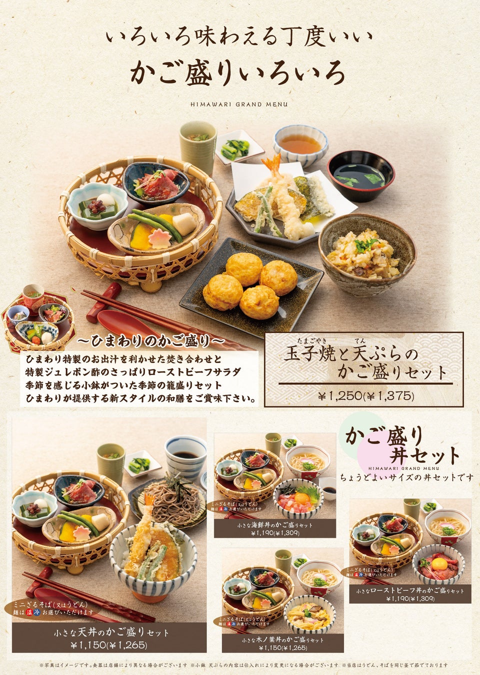 毎朝丁寧にひいた”特製お出汁”を使用した野菜の炊き合わせやさっぱりローストビーフジュレサラダ、季節の小鉢惣菜、自家製お出汁の吸い物をかご盛りセットにしてご用意。自家製玉子焼、天ぷら盛り合わせ、自家製炊き込みご飯等、ひまわりの特製お出汁の味わいをお楽しみください。