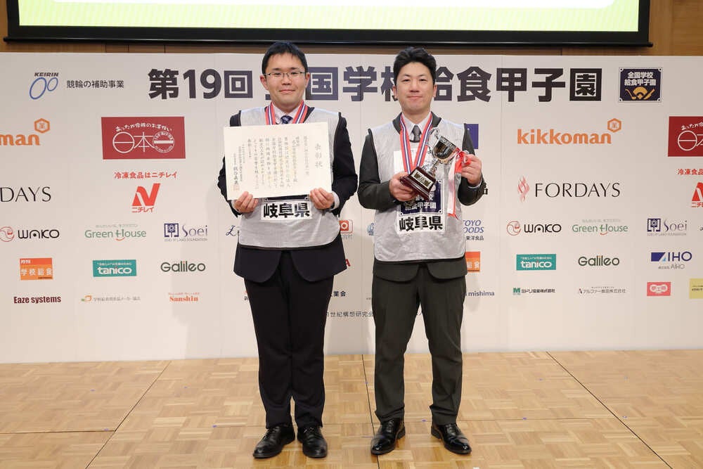 食育の啓発を目的とした学校給食の全国大会である「第19回全国学校給食甲子園®」の決勝大会が、令和6年12月8日(日)に女子栄養大学駒込キャンパス(東京都豊島区)で開催され、高山市学校給食センター所属の川原昌士さん(松倉中学校栄養教諭)と坂巻和正さん(給食センター職員)が、応募数1,051件から選ばれた12代表として出場しました。決勝大会では決められた時間内に6人分の調理を行い、審査員による調理過程と食味審査の結果、12チーム中6位となる優秀賞(株式会社日本一賞)を受賞しました。
