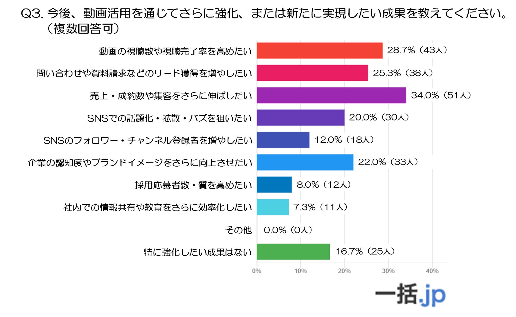 次いで「動画の視聴数や視聴完了率を高めたい」(28.7%)や「問い合わせや資料請求などのリード獲得を増やしたい」(25.3%)も多く、動画を通じたリーチ拡大や見込み顧客の獲得も引き続き強化したい領域であることがうかがえます。