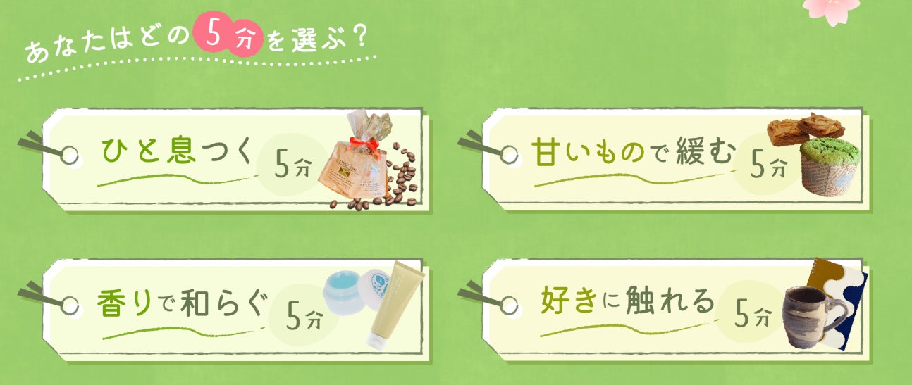 「あるる」では、日常に取り入れやすい“5分リセット”として、以下のようなカテゴリーにて少し特別感のあるアイテムをセレクト。