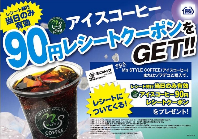お店で淹れた「M’s STYLE COFFEE」で展開中の「アイスコーヒー」を同じ日に2杯目購入する際、レシートクーポンをお持ちになると、通常価格150円のアイスコーヒーを90円でお買い求めいただけます。