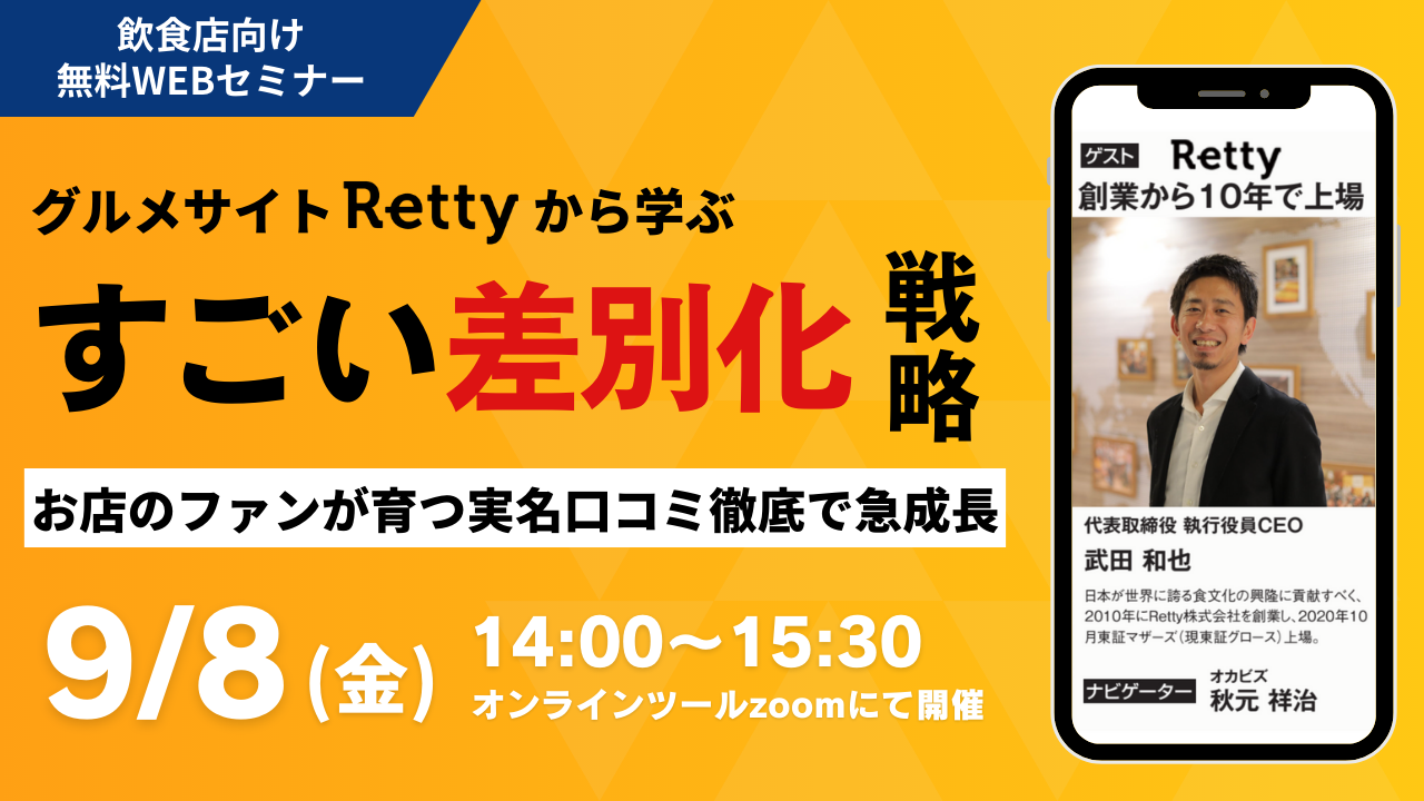 そこで本セミナーでは、Retty代表取締役 武田がお店探し方法の変化やこれからの飲食店の集客対策についてお話しします。後半パートでは、岡崎ビジネスサポートセンター 秋元氏と武田による対談を行い、参加者のご質問に答えながらすでに成熟している中で創業し成長を続けたRettyの「差別化」についても触れていきます。