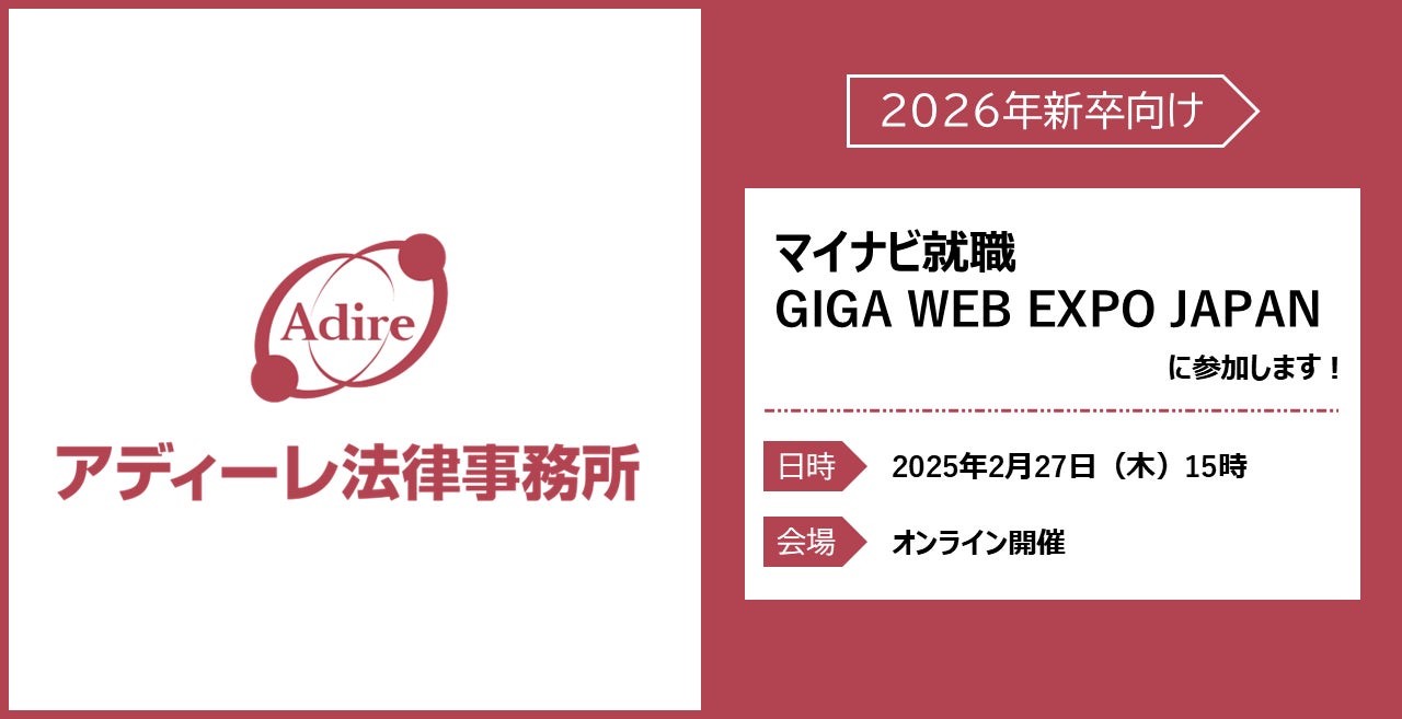 アディーレ法律事務所(東京都豊島区、代表弁護士・鈴木淳巳、以下「アディーレ」*)は、2025年2月27日(木)にオンラインで開催される、2026年卒業予定の学生向け「マイナビ就職GIGA WEB EXPO JAPAN」に参加いたします。