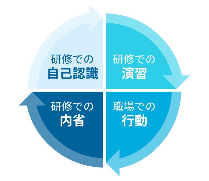 ・1つのテーマに対し、研修全体の最終ゴールと研修毎のゴールを定め、「研修での自己認識」「研修での演習」「職場での行動」「研修での内省」の4つの要素を繰り返し実践