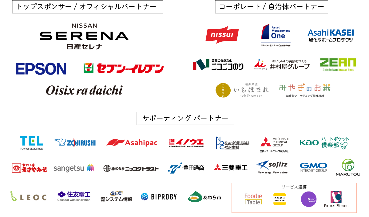 コーポレートパートナー:ニッスイ、アセットマネジメントOne、旭化成ホームプロダクツ、ニコニコのり、井村屋グループ、ゼンショー従業員組合会ZEAN