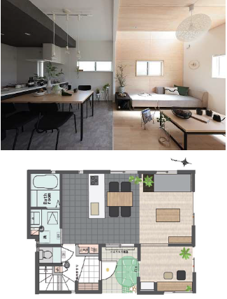 「フレーベスト秋津 奥庭」のモデルハウスです。この分譲地は、一体開発ならではのスケールメリットを活かして本来であれば家の裏側となる空間を広場や共用路地とし、「広場」「木立」「テラス」の3 つのゾーンからなる“奥庭”を創出しました。それぞれのコンセプトに応じて植栽や舗装材を使い分け、ひとつの街で3 つの異なる景色が楽しめます。また、入居後には植栽お手入れのワークショップを開催予定。室内には、段差や続き間による広さを活かした+α の空間づくりに国産素材を組み合わせ、居心地の良い空間を実現しました。