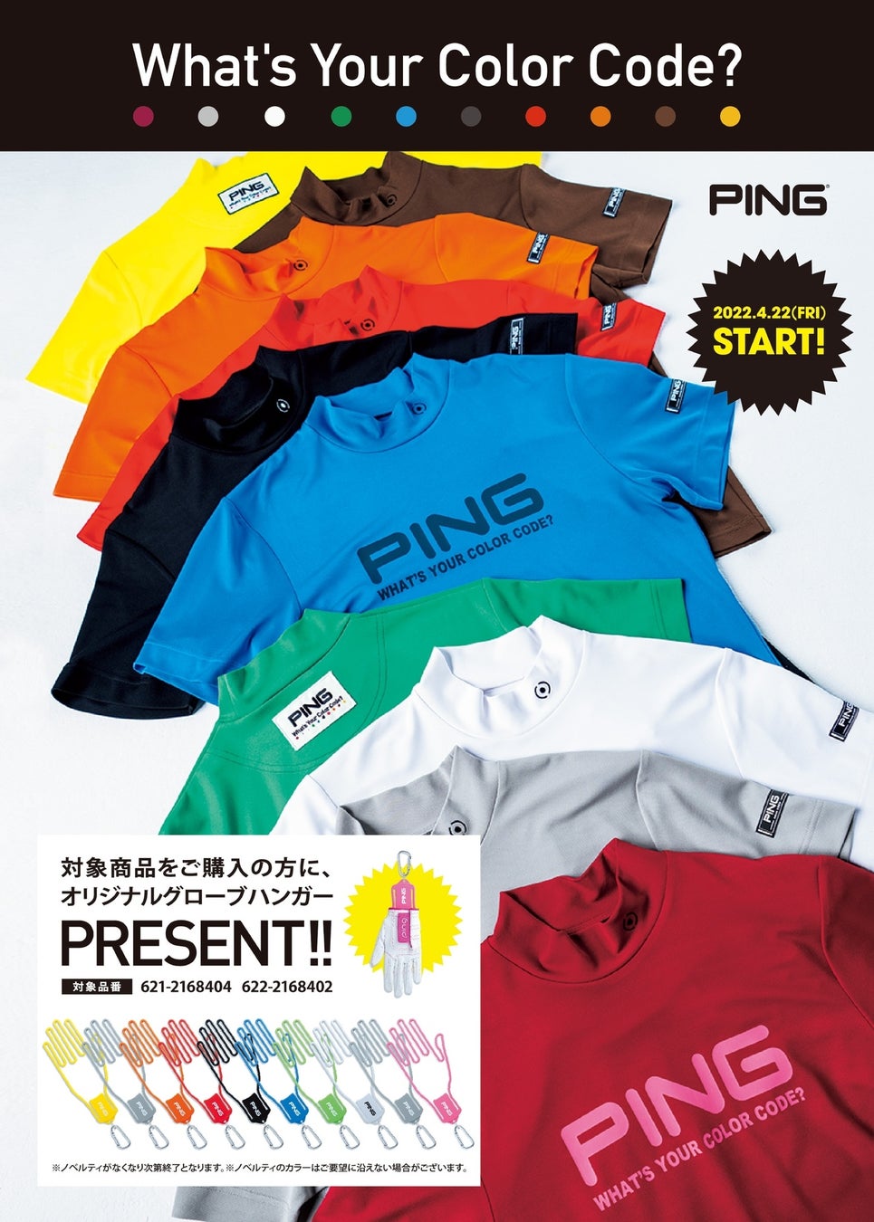 期間中、PING APPAREL直営店、PING APPAREL公式通販サイトと卸売店舗よりWhat’s your color code?対象商品をご購入の方にゴルフラウンド時に重宝するグローブハンガーをプレゼント!