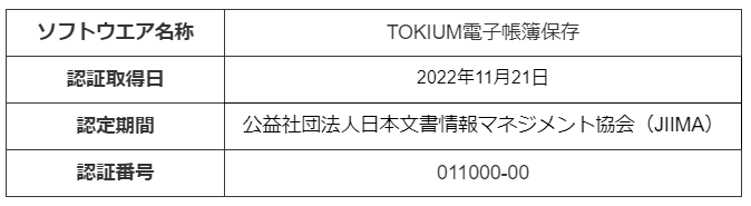 株式会社TOKIUM(本社:東京都千代田区、代表取締役:黒﨑 賢一、以下 当社)は、文書管理クラウド「TOKIUM電子帳簿保存」において、公益社団法人 日本文書情報マネジメント協会(以下 JIIMA)が認証する「 電帳法スキャナ保存ソフト法的要件」を取得したことをお知らせします。