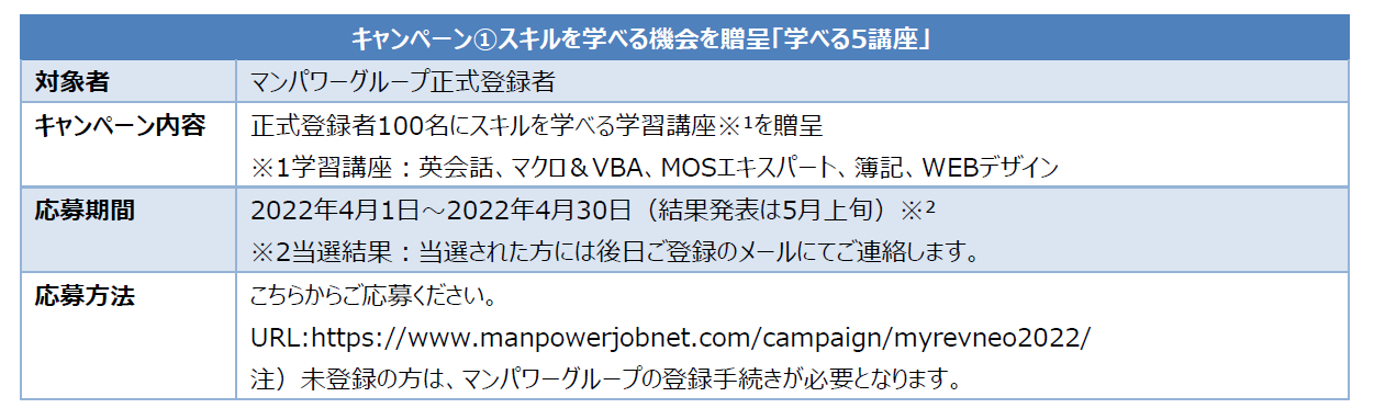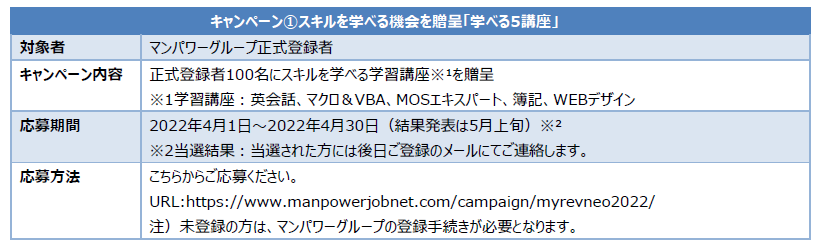 総合人材サービスのマンパワーグループ株式会社 (本社・東京都港区、代表取締役社長:池田 匡弥、以下マンパワーグループ)は、"学びたい" "成長したい" という方々の支援を目的とした、「じぶん革命NEO 2022」学ぶ意欲応援キャンペーンを本日よりスタートします。