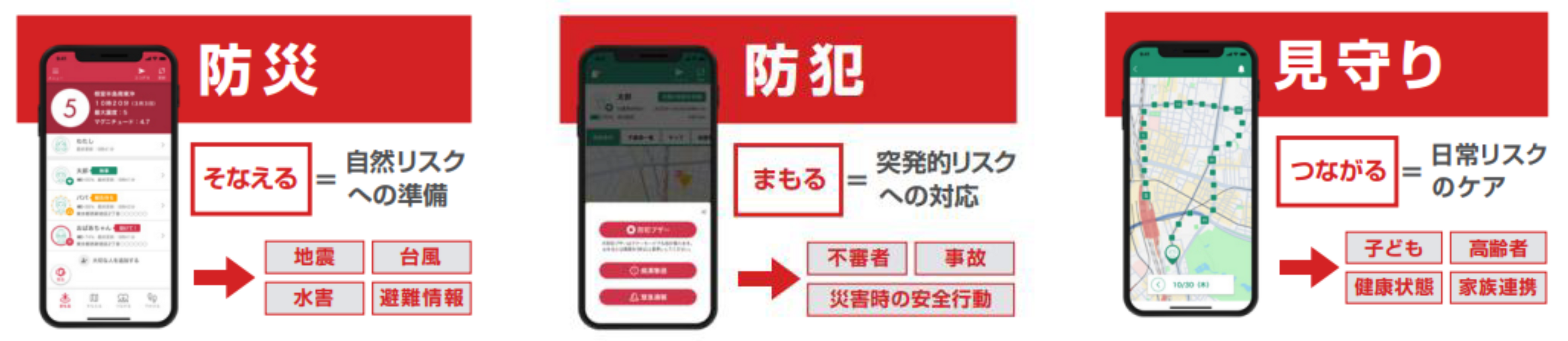 緊急地震速報との連動により登録した方の位置情報を自動共有し、すみやかな状況把握を可能にします。地震・津波・大雨などの災害情報もリアルタイムで通知。ハザードマップ・避難所情報・地域の危険情報・天気情報をアプリ内で一元管理でき、事前の備えから緊急時の行動まで一貫してサポートします。