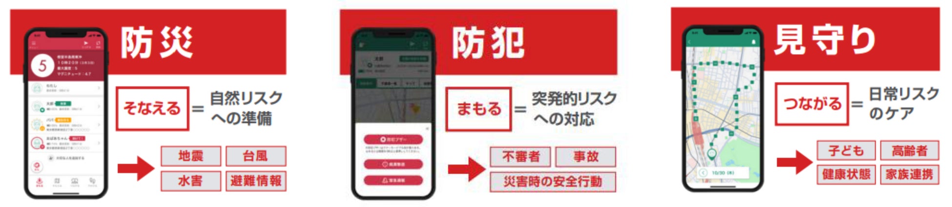 『ココダヨ Life』は、これまで個別のアプリやツールに分かれていた防災・防犯・見守りの機能をまとめ、多言語に対応したスマートフォンアプリです。災害情報・防犯情報をリアルタイムで通知し、位置情報の共有による日常の見守りも可能です。iOSでは生体情報(移動経路などのヘルスケア情報)共有機能も搭載。プライバシーに配慮し必要なときにだけ情報が届く設計のもと、日常から緊急時まで暮らし全体をシームレスにサポートします。