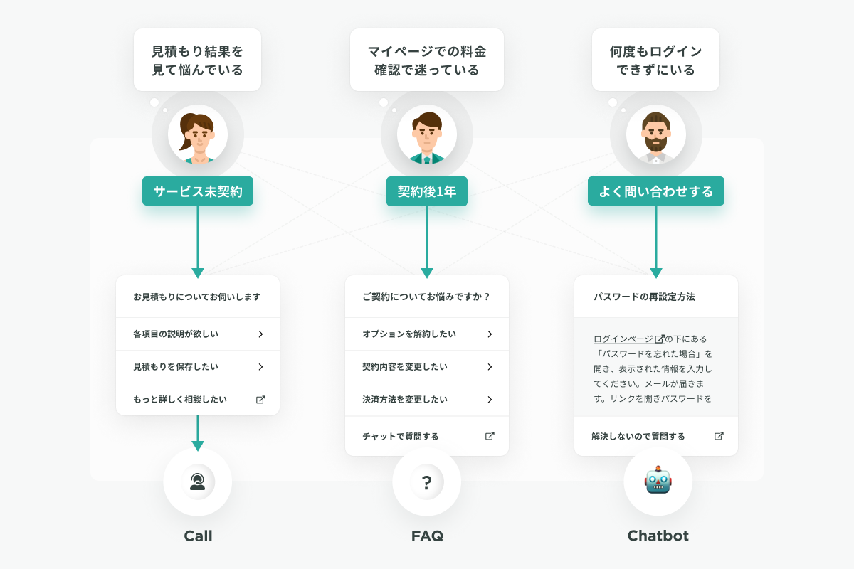 ①と②で可視化された一人ひとりのお困りごとに即したFAQ / チャネルを、お困りごとが発生したタイミングで提示し、自己解決を促進