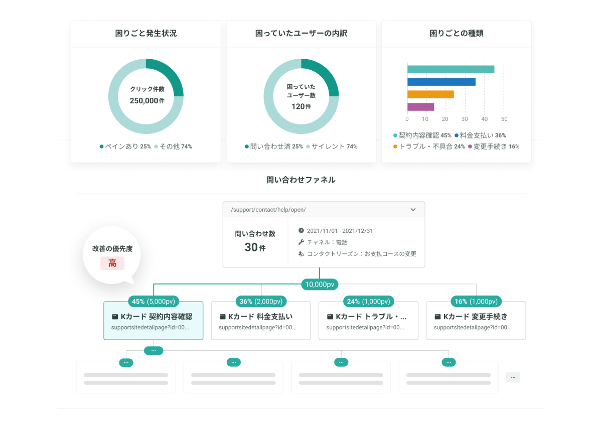また「問い合わせ前の顧客の課題を把握する」ためのダッシュボード/レポート機能が充実しており、これらを活用することで「どこを改善すれば問い合わせが効率化されるのか?」「どこでどんな問題が発生しているのか?」が明確になります。結果として、ネックとなっている箇所・ページ・コンテンツや実際の課題を把握することができ、自己解決に向けた改善活動につなげることができます。