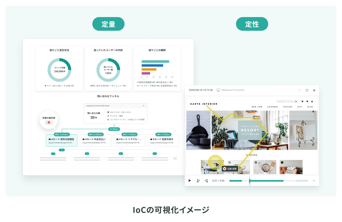 タグ一行で顧客の問い合わせ前の行動データを収集/解析し、IoC(顧客のあらゆるお困りごと)を自動で推定します。