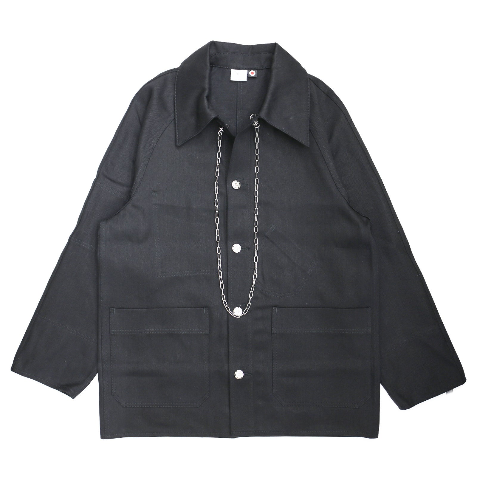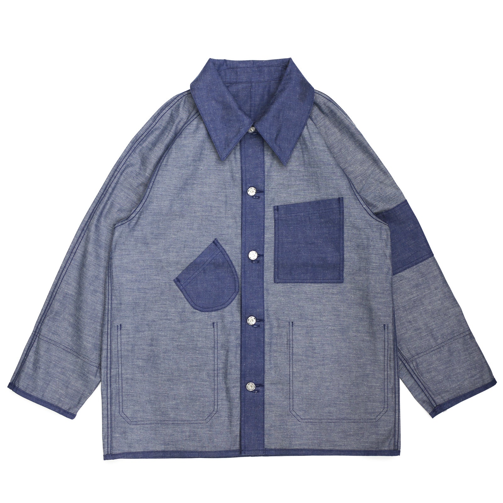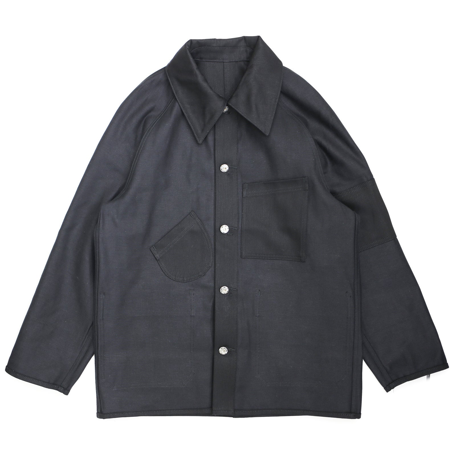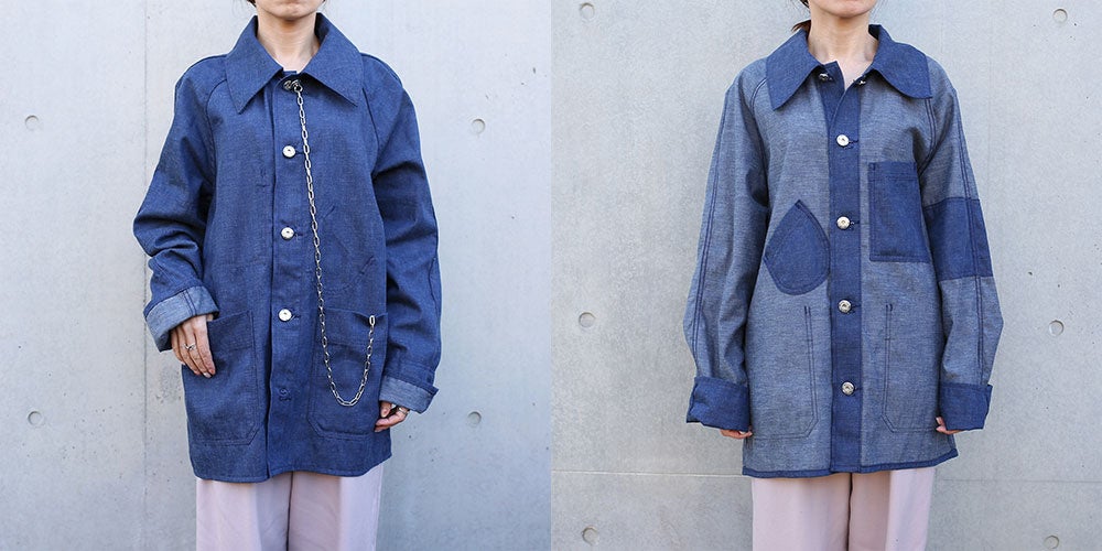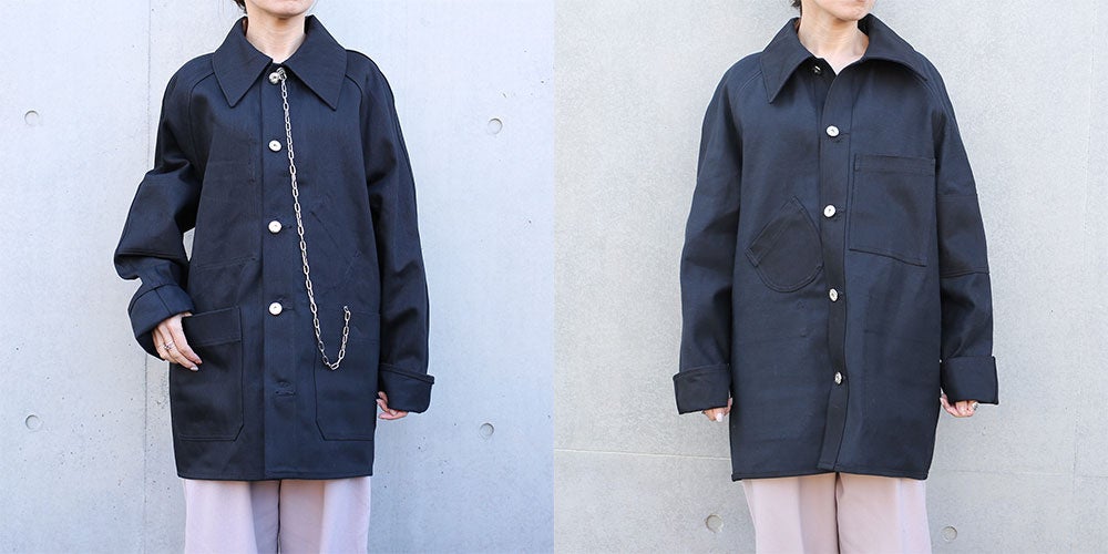 象徴として、尖ったバリモアカラーが特徴。逆が表のリバーシブル仕様に仕立て、フリップするとレイルロードJKT。懐中時計用のラウンドポケットや、腕章のディテールが現れます。ボタンは、どちらを表に着てもストレスの無いように、取り外し式のとってもいいボタン。飾りの二重カンは、外してアクセサリーにも転化する。形状はカルフォルニア・ゴールドラッシュ初期のカバーオールをイメージしながら、フランス鉄道や、国鉄ナッパ服のレイルロードJKTのディテールを細部に落とし込んだ各国の労働着が混在するデザインとなっています。