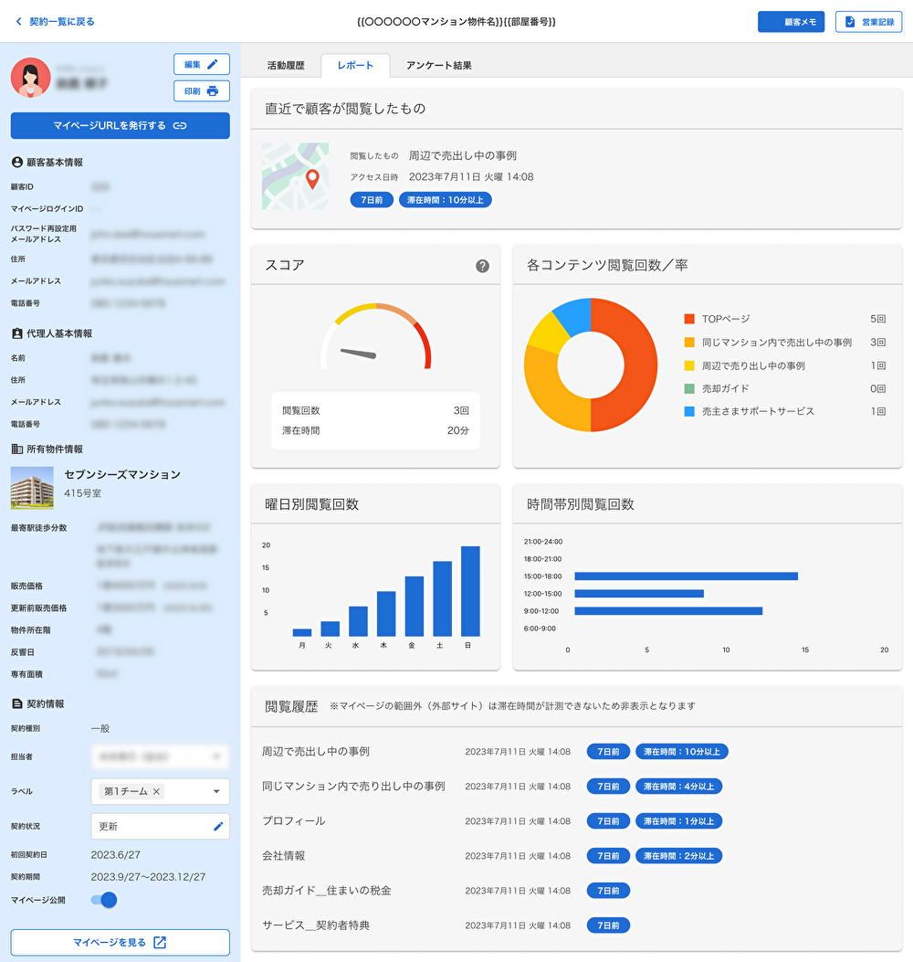 マイページ上の顧客行動(マイページへのアクセス、閲覧コンテンツ、コンテンツごとの閲覧回数など)を閲覧できるため、より売主の希望に沿ったフォローが可能になる