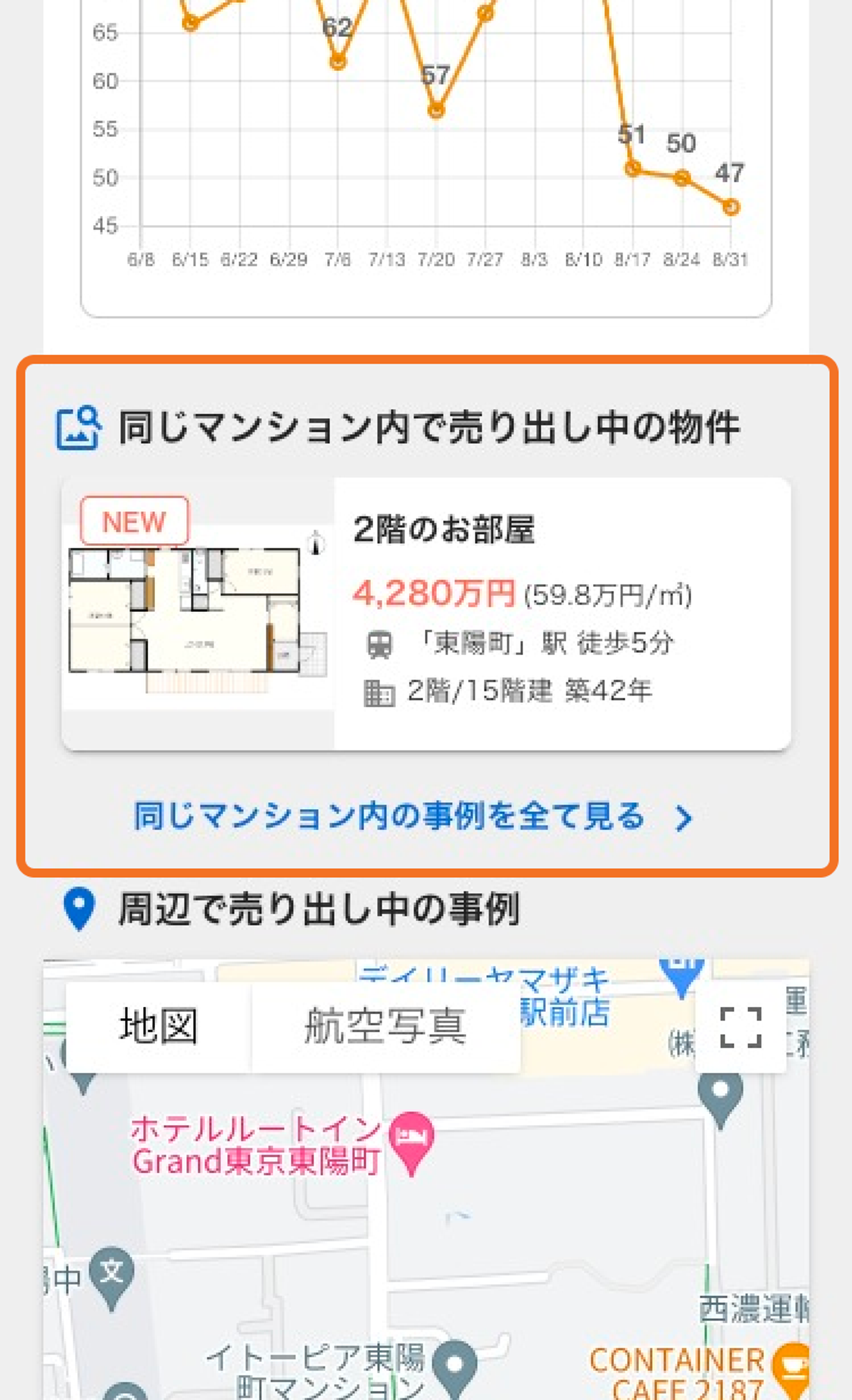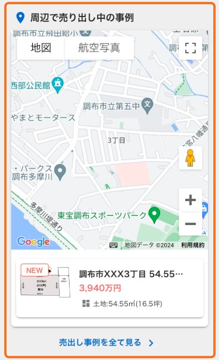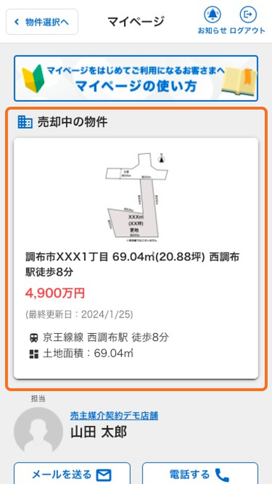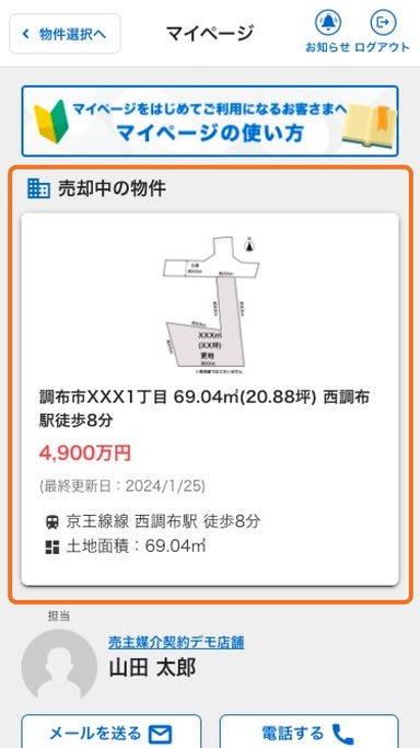 マイページ上で、所有物件と同じエリア内での売り出し事例などを閲覧でき、販売価格の調整などに参考にできる