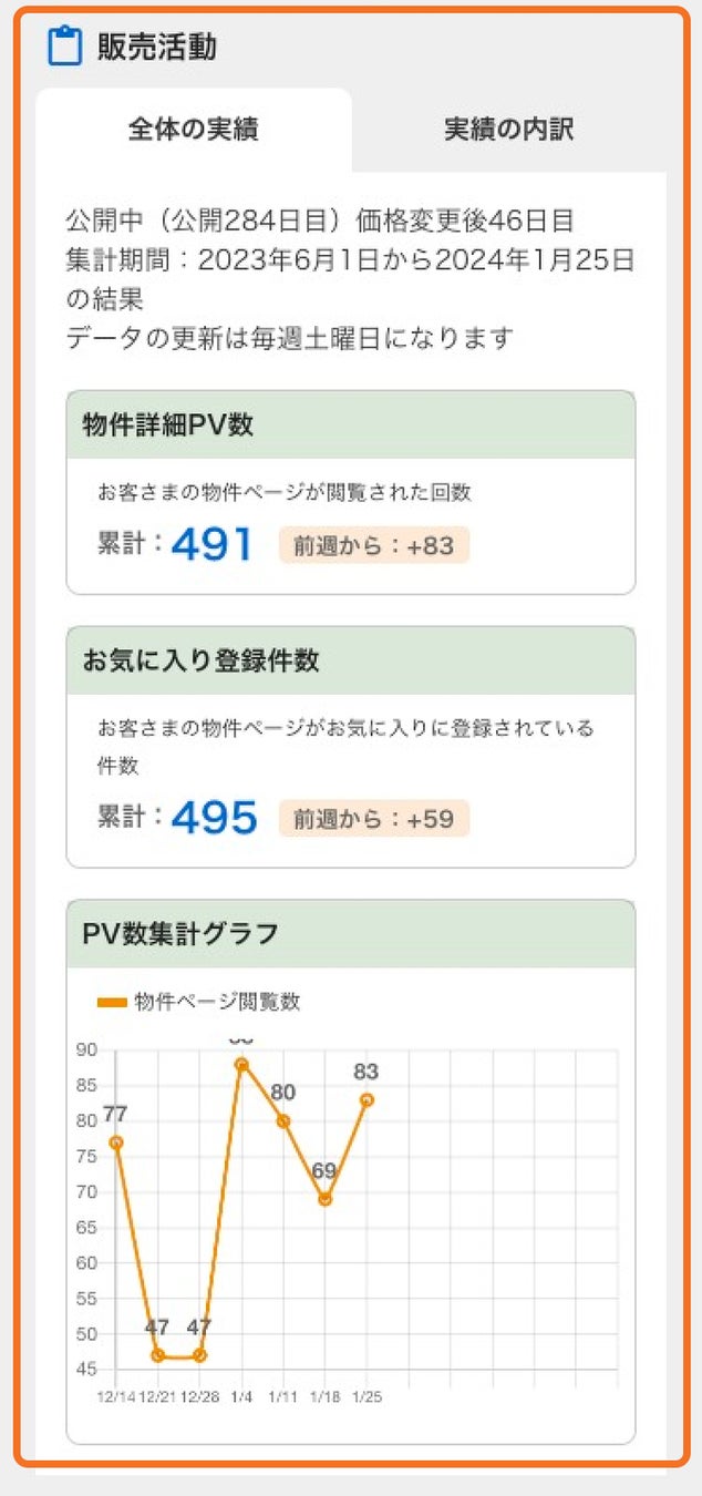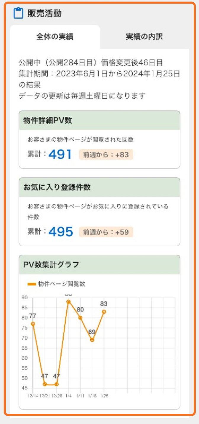 売却物件掲載ページの閲覧件数など、売出物件の販売状況がスマートフォンやパソコンからタイムリーに確認できる