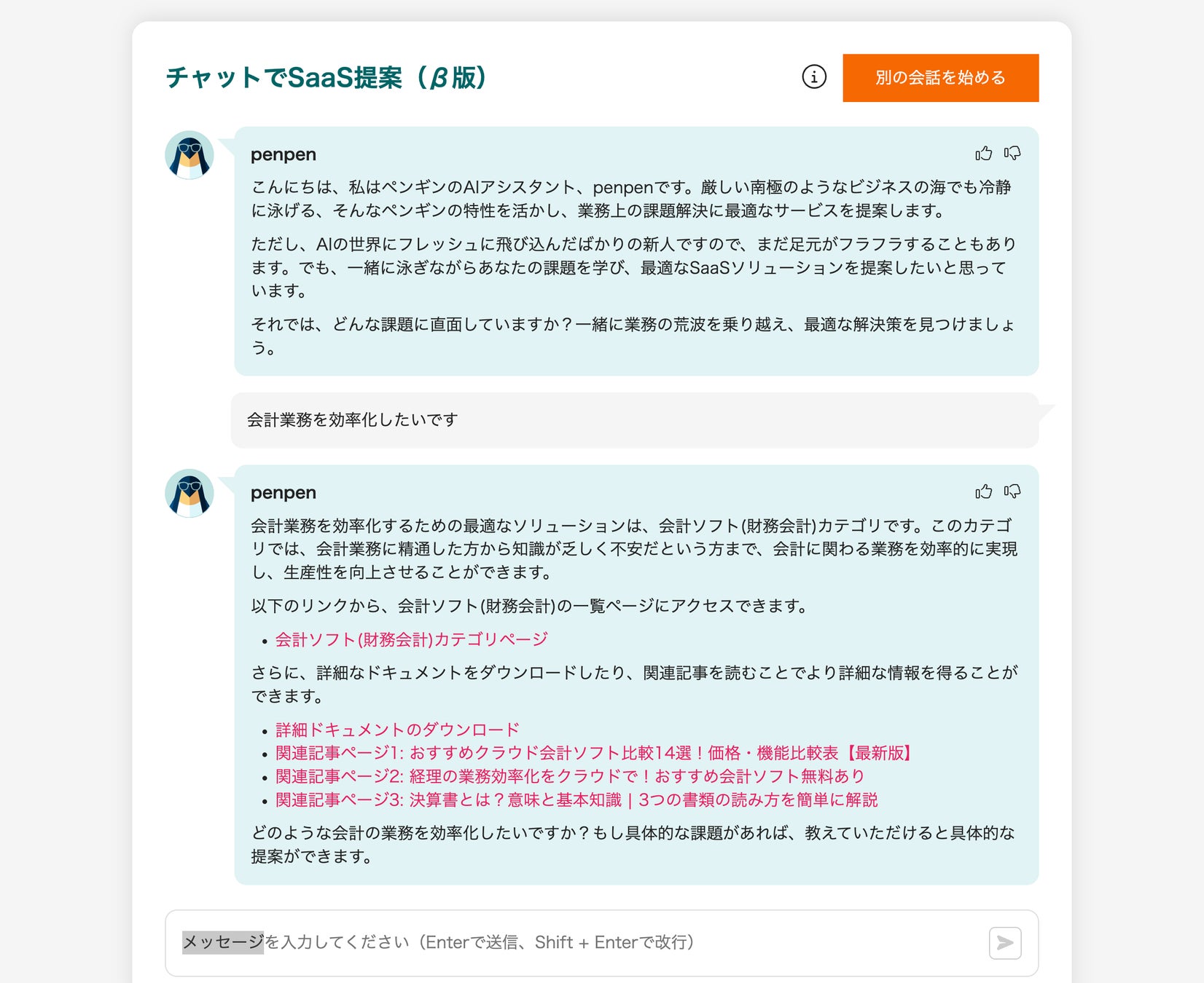 3. Penpen(コンシェルジュ):「BOXIL SaaS」や「BOXIL Magazine」が提供する情報から該当するSaaS一覧や関連する記事を提案