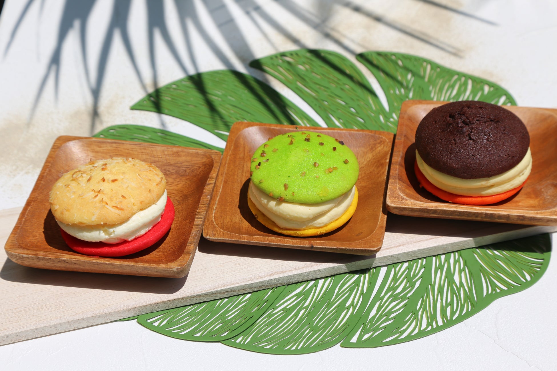フライベント内で開催する今回のポップアップストアでは、アメリカの伝統的な焼き菓子であるウーピーパイ(Whoopie Pie)をハワイアンテイストにし、ひんやり冷やして提供します。美味しくて“whoopie(イヤッホー)!”と喜ばれることから名づけられたパイは、マカロンのように丸く、しっとりとした食感の生地に、バタークリームやマシュマロがサンドされているものです。ご用意したウーピーパイは、ココハイ(ココナッツ&ハイビスカス)、リリコイパイン(パッションフルーツ&パイナップル)、マンゴーライチ(マンゴー&ライチ)の3種類。クリームやゼリーに南国のフルーツや花を使用し、ハワイの香りを詰め込みました。また、Pie Holicで人気の高いアップルパイと、各種ドリンクも販売します。