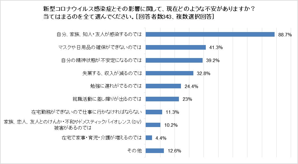 その後2020年4月に、プランが15歳~29歳の女の子と若年女性を対象に実施した、新型コロナウイルスの影響に関するオンラインアンケートでは、回答者のうち94.2%が何らかの不安を感じており、特に「女性である」という理由から、家事・育児の負担増加、失業等の経済的な影響への不安、DVや性暴力の被害への不安、さらにマイノリティ女性が受ける差別や困難への懸念があることが明らかになりました。